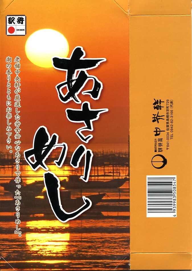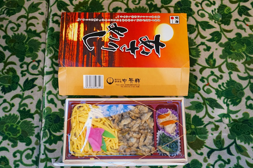 おそらくJR九州の駅弁キャンペーン「第4回九州の駅弁ランキング」の開催に向けて、2007(平成19)年の秋に発売。2014年の第11回九州駅弁グランプリにもエントリー。長方形のプラ容器を、ノリ養殖が盛んな有明海の夕景と思われる写真を使うスリーブに収める。中身は味付け御飯の上を、アサリと太めの錦糸卵で半分ずつ覆い、菜の花と山ゴボウにうみたけ粕漬を添えるもの。