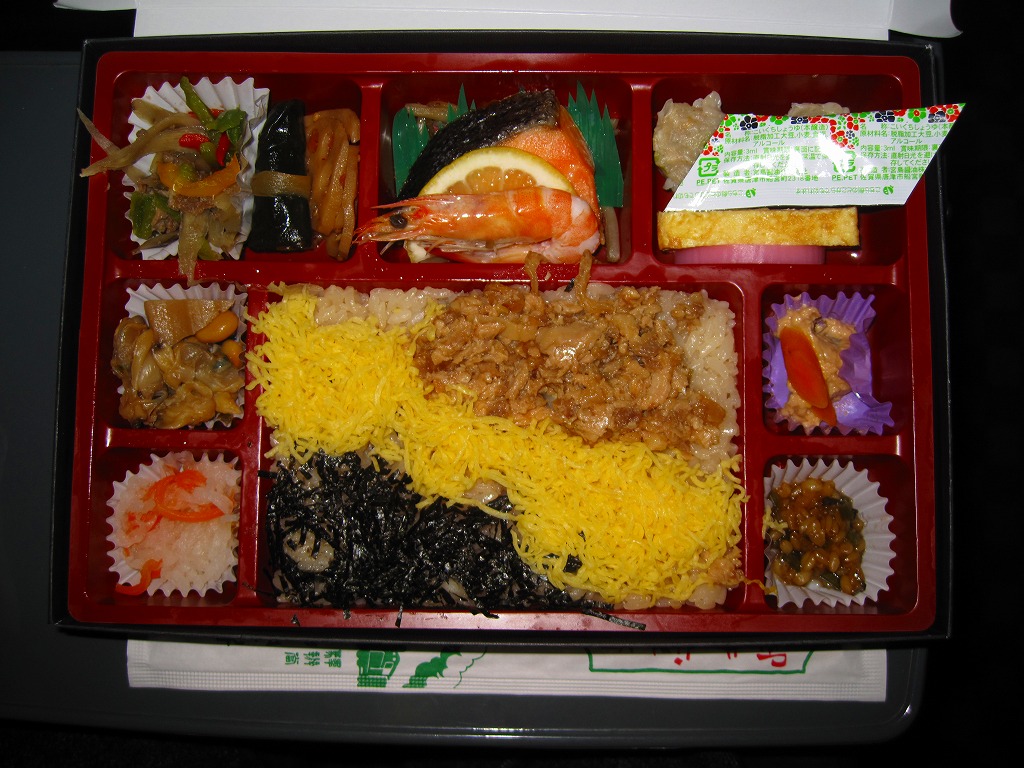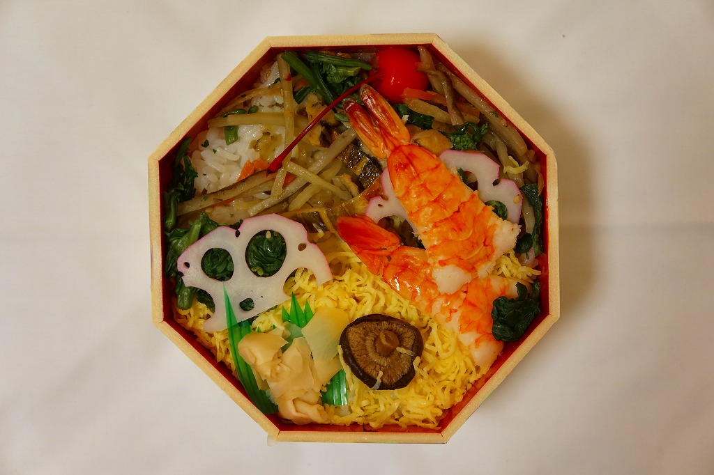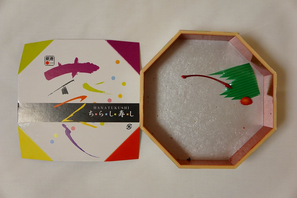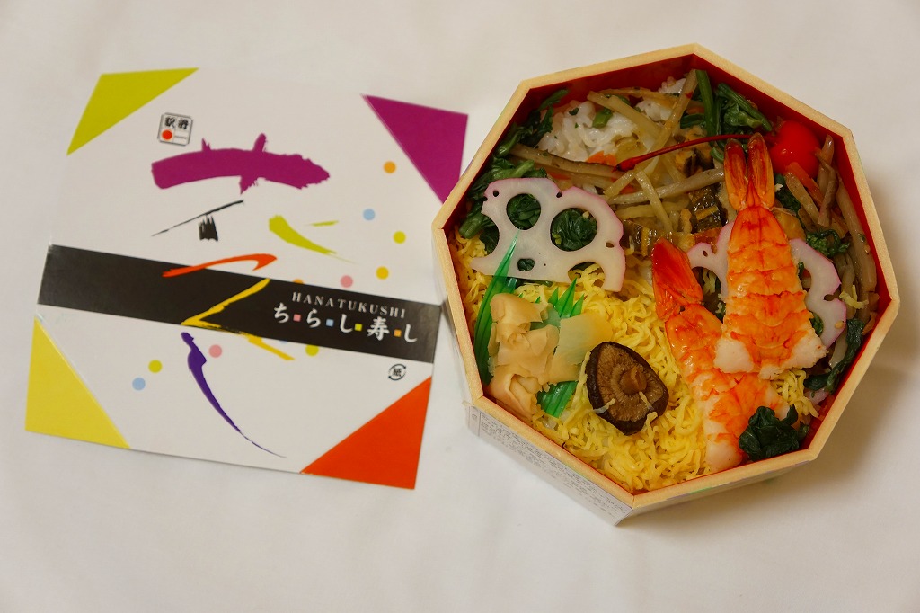 鳥栖駅の駅弁である、この無名のちらし寿しは、いつから売られているのだろうか。正八角形の容器に酢飯を敷き、錦糸卵と山菜やごぼうで覆い、海老、椎茸、蓮根、甘酢生姜などを散らす。価格は2010年時点で740円、2014年時点で760円、2023年時点で780円、2024年12月から830円。