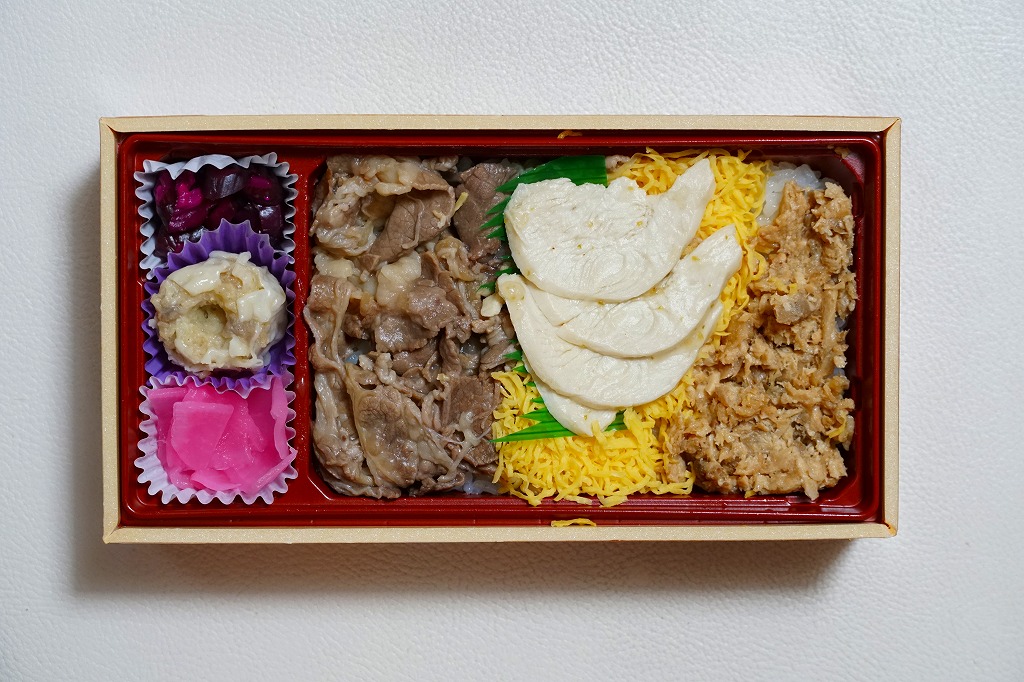 2004(平成16)年の秋頃に発売か。下記の駅弁「辛子めんたい弁当」とまったく同じ赤いプラ容器を、赤と緑で地柄と文字の色を逆にしたスリーブに収める。中身は茶飯の上を、鶏フレークと錦糸卵と牛肉のストライプで覆い、はじかみと大根桜漬を載せたもの。つまり「かしわめし」と「牛めし弁当」を足して2で割ったもの。「三昧」というほど肉が大量に入るわけはないが、牛鶏丼の感覚でモリモリと食べられる。