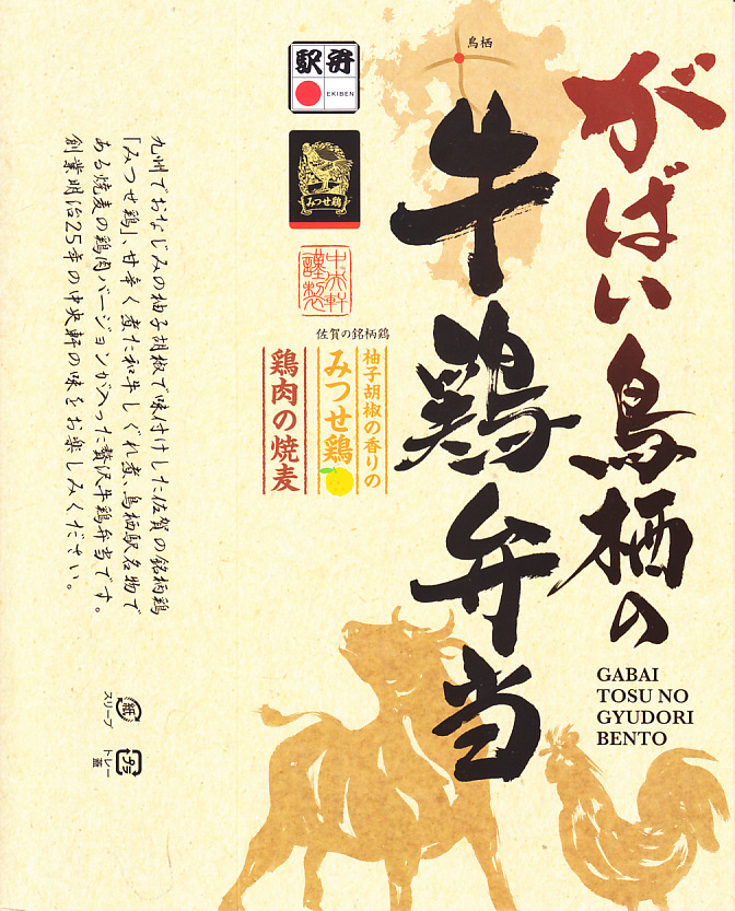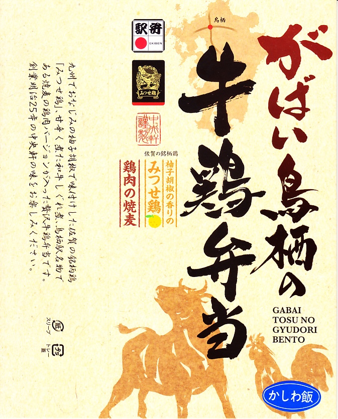 2021(令和3)年10月に鳥栖駅と新鳥栖駅で発売。酢飯を和牛しぐれ煮と錦糸卵と佐賀みつせ鶏の柚子胡椒風味のフレークで覆い、鶏ささみを並べ、鶏しゅうまい、柴漬け、大根桜漬を添える。映画や高校野球で2007年頃に流行した佐賀弁「がばい」と、昭和時代の鳥栖駅弁「とりちらし寿し」にヒントを得たのかもしれない、お肉で酢飯を食べるお弁当。名前も見た目も、現地というよりはむしろ催事で売りそうな駅弁に思えて、しかし催事でその姿を見たことがない、現地の駅弁。価格は2021年の発売時で1,000円、2024年時点で1,200円。