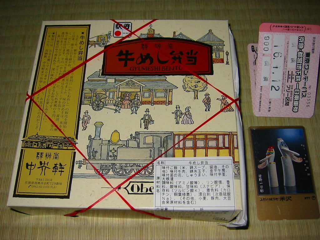 鳥栖駅の駅弁「焼麦弁當」などと同じ正方形の容器に、レトロモダンでハイカラな鉄道風景やアイテムを描いた掛紙兼用のボール紙のふたをする。中身は味付け御飯の上に錦糸卵を敷き、しぐれ煮風の牛肉とごぼうの煮付けなどを載せるもので、焼麦こと焼売がひとつ付く。写真は東京の百貨店の駅弁大会で購入したものなので、見た目の悪さは割り引く必要があるが、メインの牛肉が少量で硬く、一方で「かしわめし」と共通の御飯はおいしいので、やはり鳥栖の駅弁は焼麦と鶏飯が良いなと思う。2006年頃に販売を終えた模様。