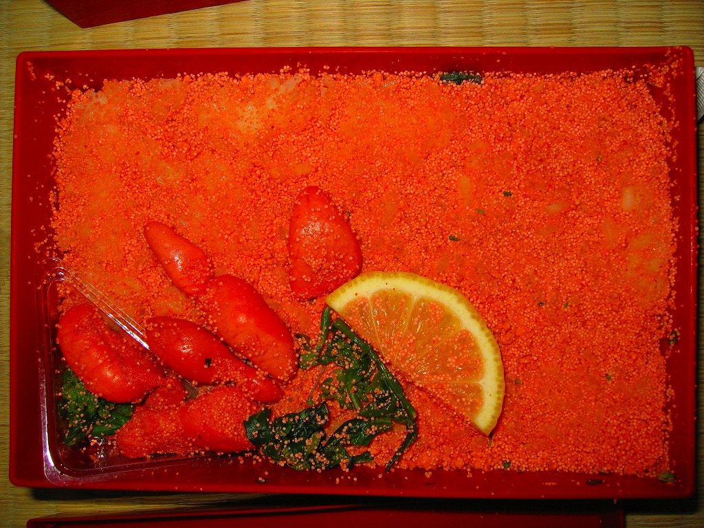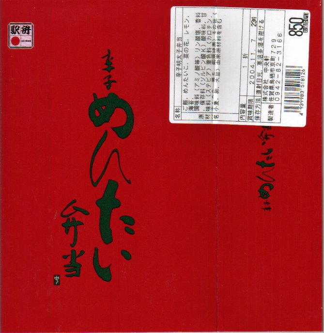 2004(平成16)年秋の新製品か。真っ赤なプラ容器を、やはり真っ赤で商品名を緑色の文字で書いたスリーブにはめる。中身は御飯の上を砕いた辛子明太子で覆い尽くし、塊の辛子明太子にレモンや菜の花を添えたもの。辛子明太子が大丈夫、辛いものを食べて問題ない人のみが、いただけるお弁当。そうでないと本当に食べる所がない。催事では福岡空港の空弁として販売。福岡空港や鳥栖駅でも売られたはずだが、販売の光景を目撃することはできなかった。現存しないと思われる。