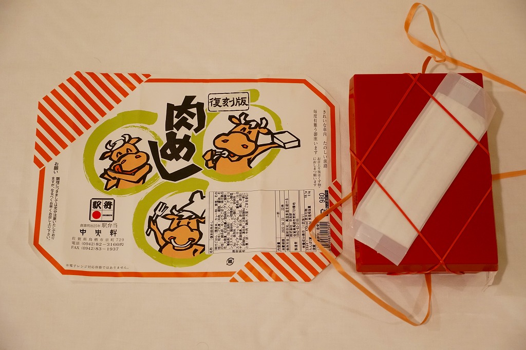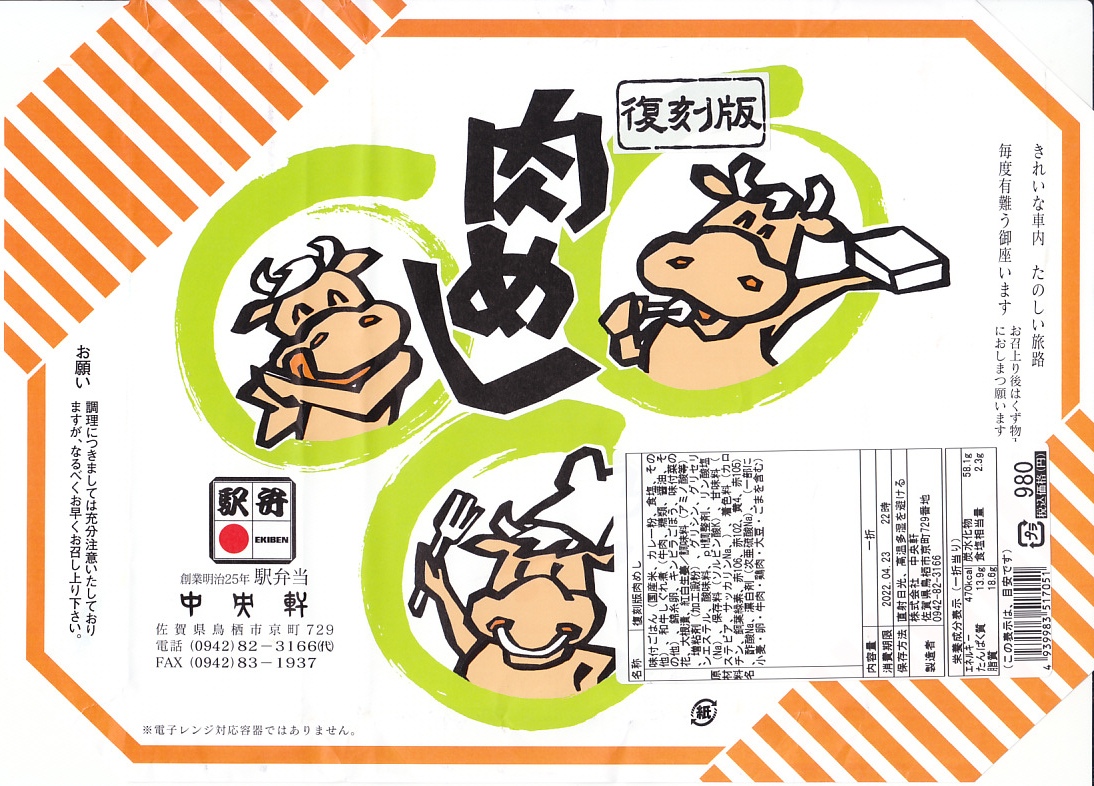 掛紙の絵柄は、当時も今も久留米駅でみられる「肉めし」のものに「復刻版」の表記を加えたもの。赤くて硬い長方形のプラ容器に、カレー粉の味付飯を敷き、和牛しぐれ煮と錦糸卵で覆い、きんぴらごぼう、はじかみ、菜の花、大根漬を添える。昭和の昔の牛肉駅弁の雰囲気を、常温でうまくなかった赤黒く硬い肉を個性だと受け入れさせる工夫を、再現したようには思える。復刻版を名乗るわりには、かつてのものとは容器に加えて内容も味も差異が大きいと感じる。価格は2022年の発売時で980円、2024年12月から1,080円。