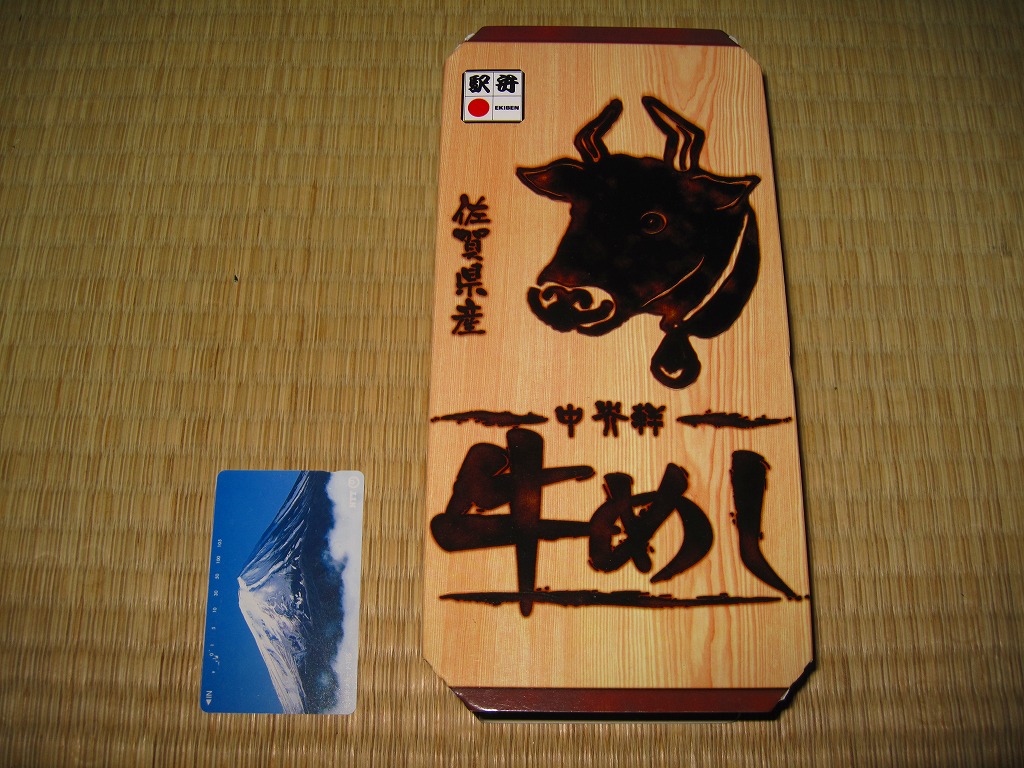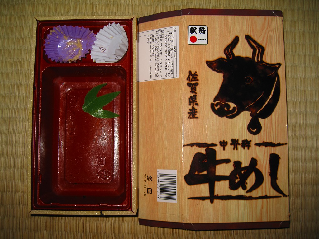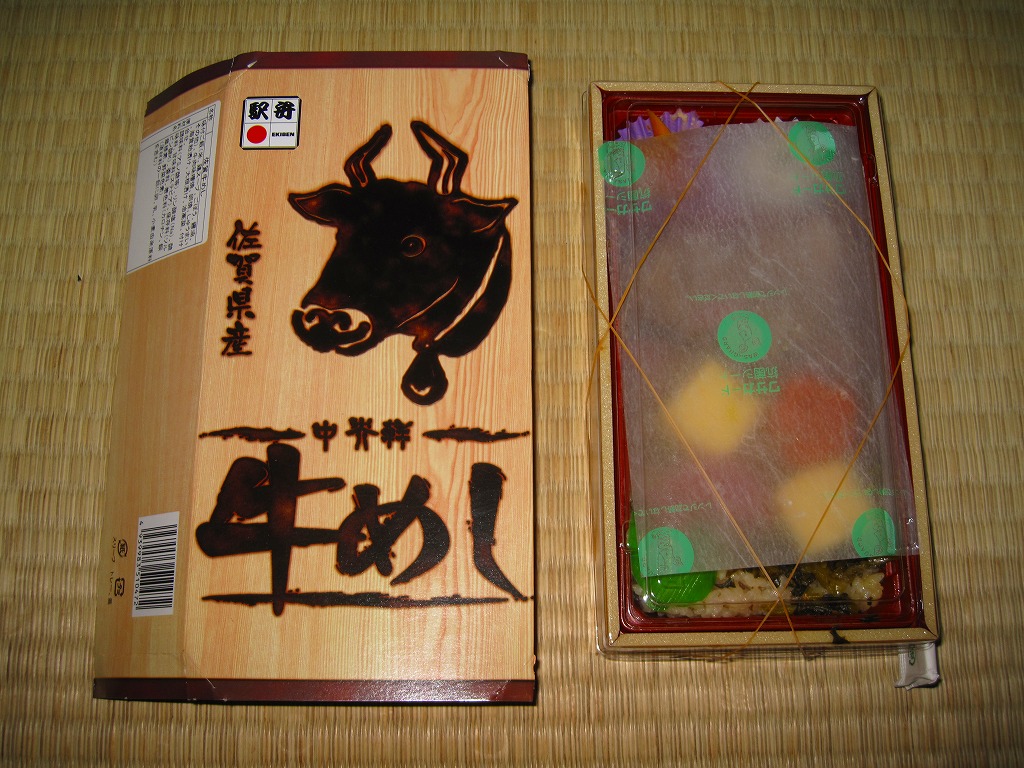 下記の駅弁「牛めし弁当」の、2011(平成23)年時点での姿。長方形の容器に透明なふたをして、牛顔や駅弁の名前を焼き印のように印刷した木目柄なボール紙の枠にはめる。中身は鶏ガラスープの味付飯の上を佐賀牛の牛肉味噌煮と高菜の油炒めである程度覆い、玉子焼、ニンジン、大根漬も貼り、うみたけや焼麦などを添えるもの。