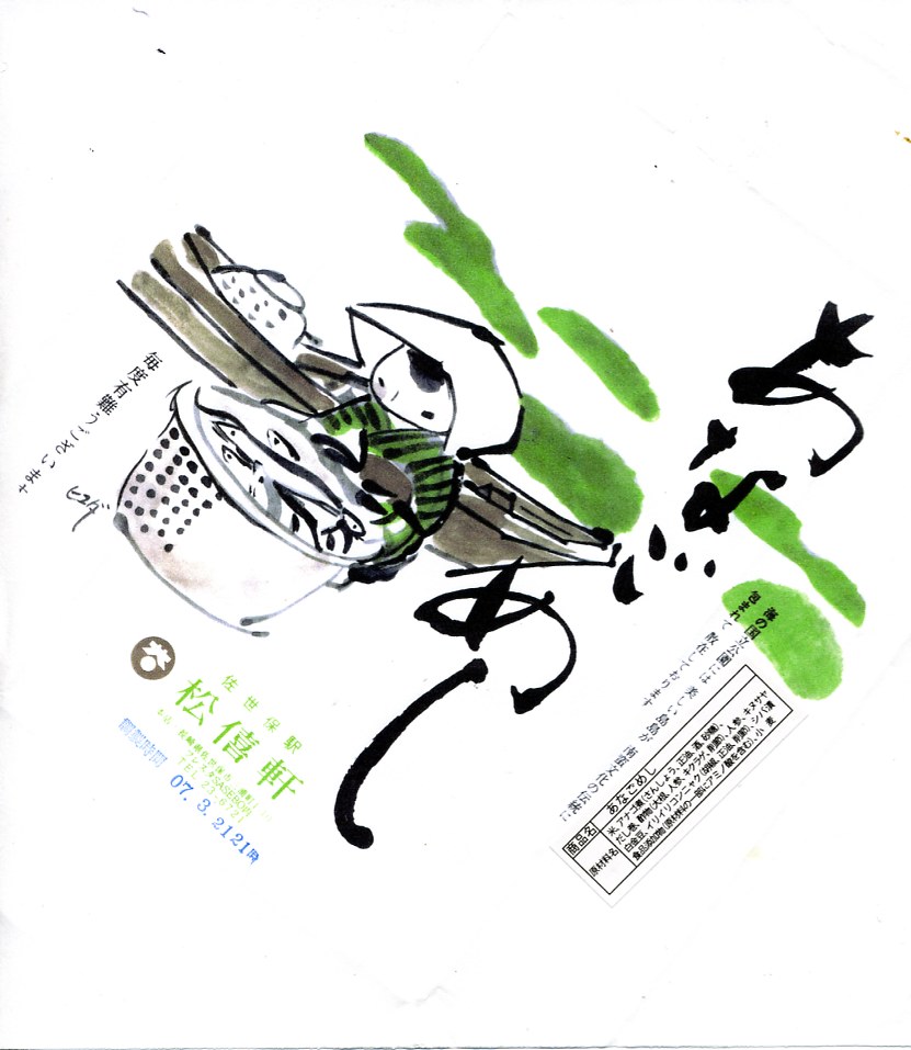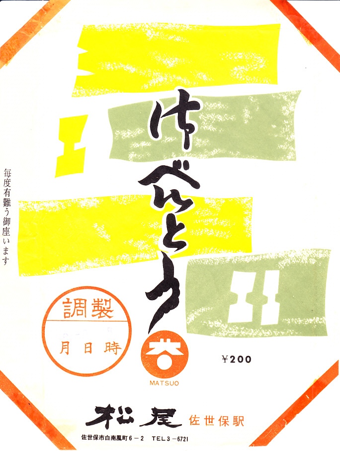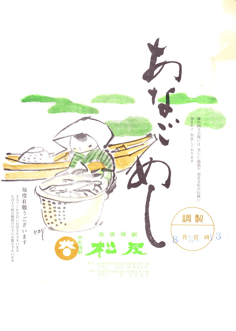 1970年代のものと思われる、昔の佐世保駅弁の掛紙。掛紙に「佐世保駅」と書いてはいるものの、調製元は佐世保駅の駅弁では「松僖軒」(しょうきけん)を名乗ったため、この「松尾」の掛紙は駅弁でなく駅前で売ったり仕出しする弁当かもしれない。