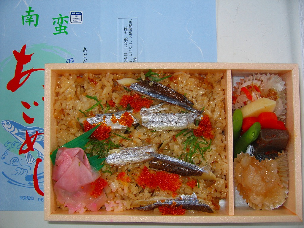 長方形の容器に、アゴの身とだしを含んだ混ぜ御飯を詰め、アゴの身と卵を載せ、煮物や漬物などを添える。「アゴ」とはトビウオのこと。掛紙に「あごだしで有名な」と書かれるとおり、出汁が取れる魚なので、2003年に食べた時は御飯にも身にもとてもダシが利いている感じがして、2005年ではそこまでいかない軟らかな味。