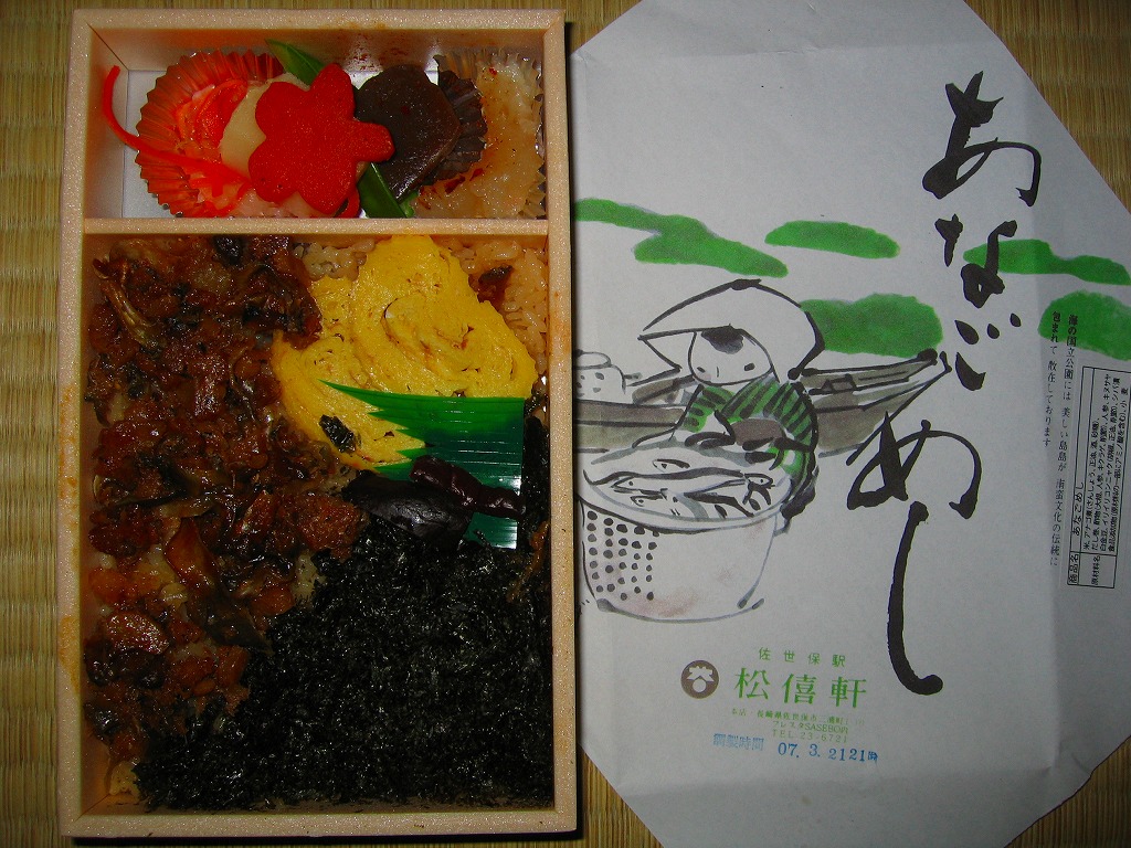 穴子駅弁の分布地図からぽつんと離れて存在した、半世紀の歴史を刻む無名の駅弁。「レモンステーキ弁当」などと同じ容器に、アナゴの炊込飯を詰め、刻みアナゴと刻み海苔で覆い、だし巻き卵を載せ、煮物や酢の物を添える。九州の各地で名物の駅弁となる鶏飯「かしわめし」の、鶏を穴子に替えたようなイメージ。掛紙の絵柄も含めて味わいは並レベルでも、こういうものがあることがよいことで、催事ではなく地元で仕事をする駅弁。調製元の閉店により、2014年7月限りで終売した模様。