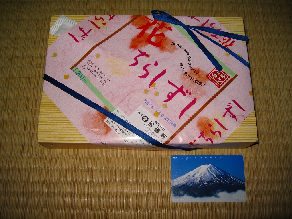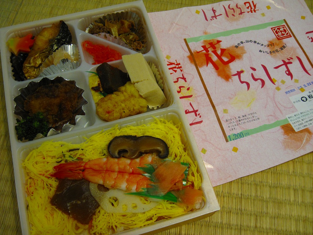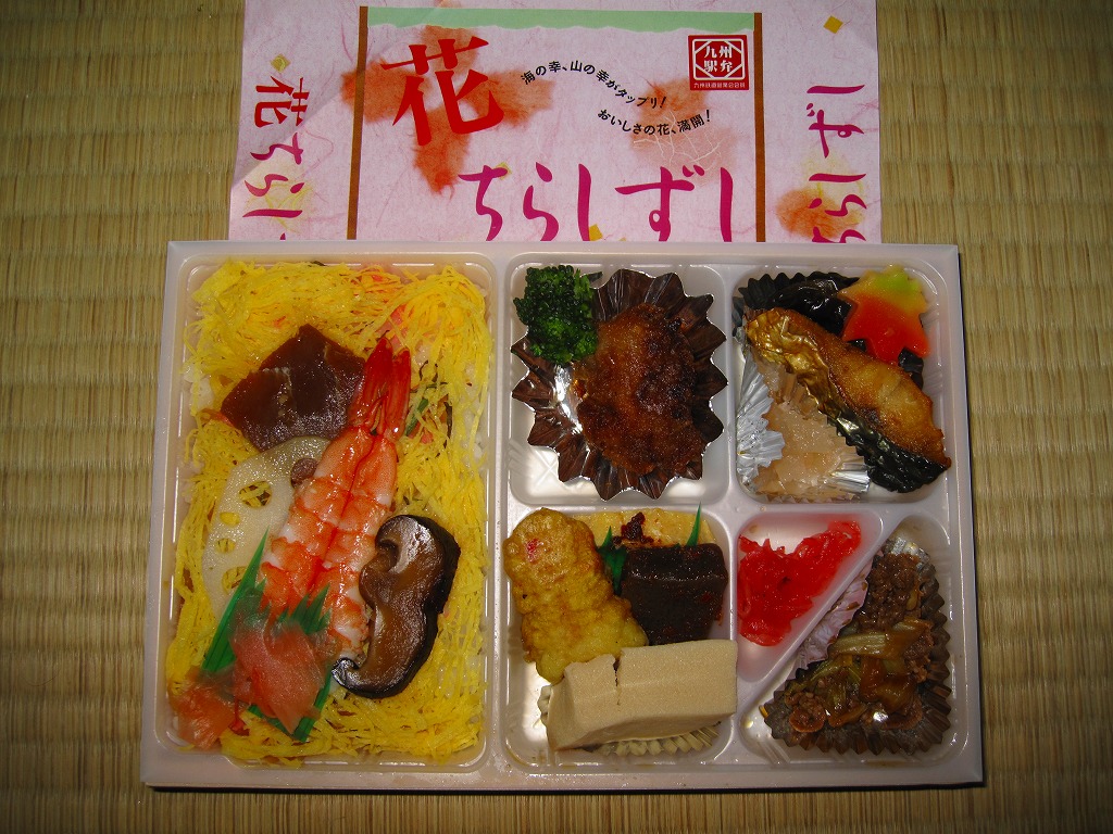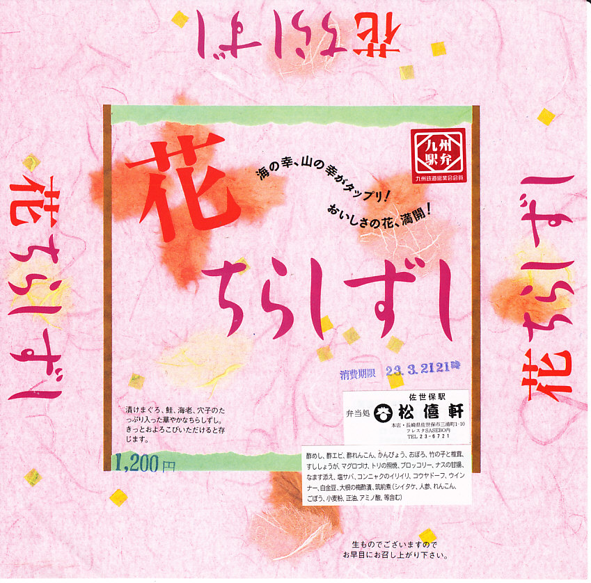 平たい長方形の容器に木目柄のボール紙でふたをして、花色の小さめな掛紙を置く。半透明のプラ製トレーに収まる中身は、ボイルエビやマグロづけやシイタケやレンコンなどを使うちらしずしに、サバ塩焼、鶏照焼、筑前煮、揚げナスなど。単価の高そうな内容だが、佐世保らしさ、駅弁らしさ、豪華らしさが見えてこない。調製元の閉店により、2014年7月限りで終売した模様。