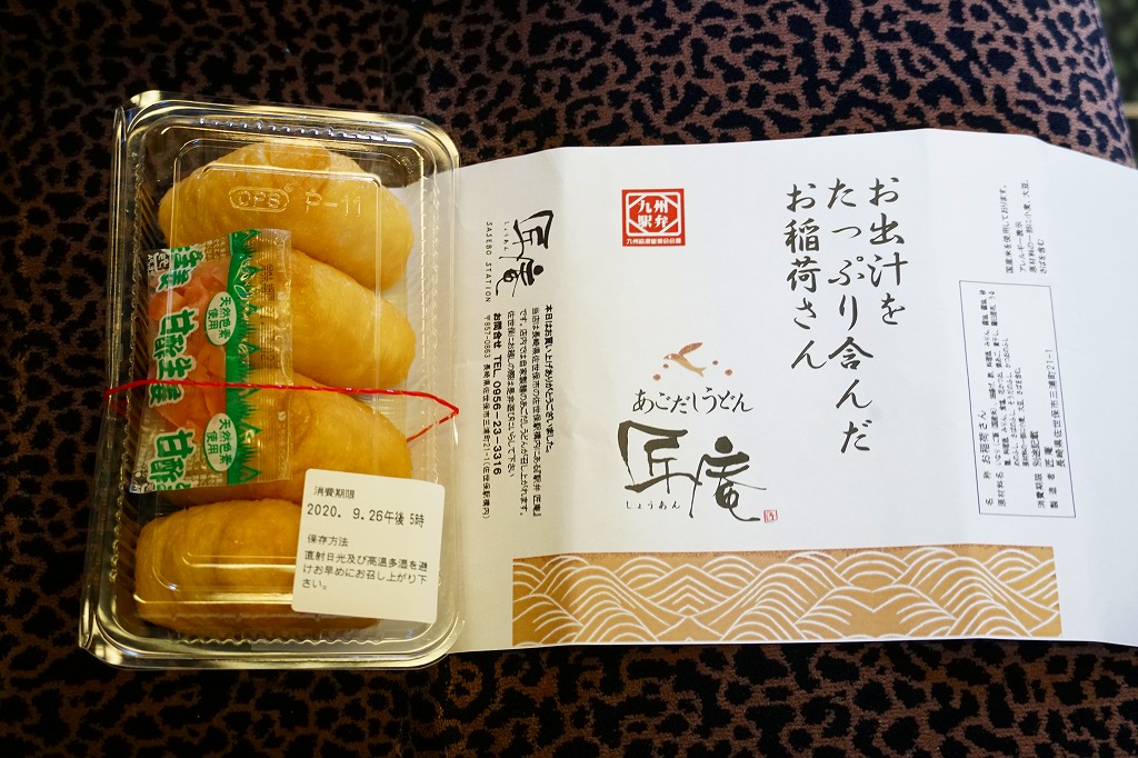 2015(平成27)年8月6日に佐世保駅でオープンしたうどん店「匠庵」の店頭で売られる商品。五目飯をお出汁あるいはうどんの汁を吸ったお揚げで包んだ、淡い色をした二等辺三角形のおいなりさんを、透明なプラ容器に4個収め、商品名を書いた掛紙を巻く。