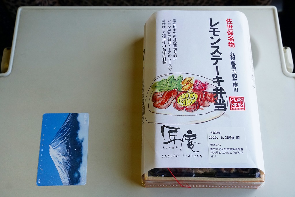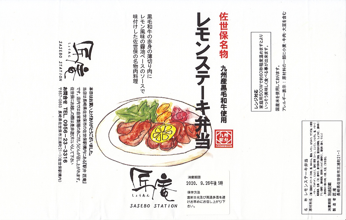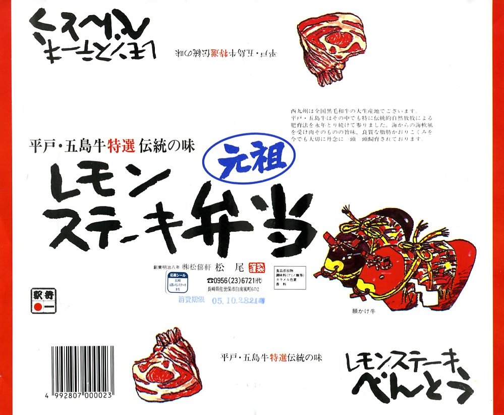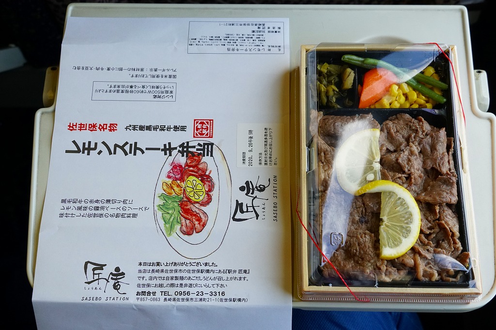 レモンステーキとは、この駅弁の調製元が佐世保市内で1955(昭和30)年に創業した食堂「れすとらん門」で、その開店当時あるいは昭和40年頃に考案されたメニューだという。厚切り肉ではなく日本人に合いそうなすき焼き肉を使い、レモンを使った醤油ベースのソースをかけたもの。地域の特産品によらないご当地グルメの中では、佐世保では佐世保バーガーに次ぐ支持を集めている感じ。
