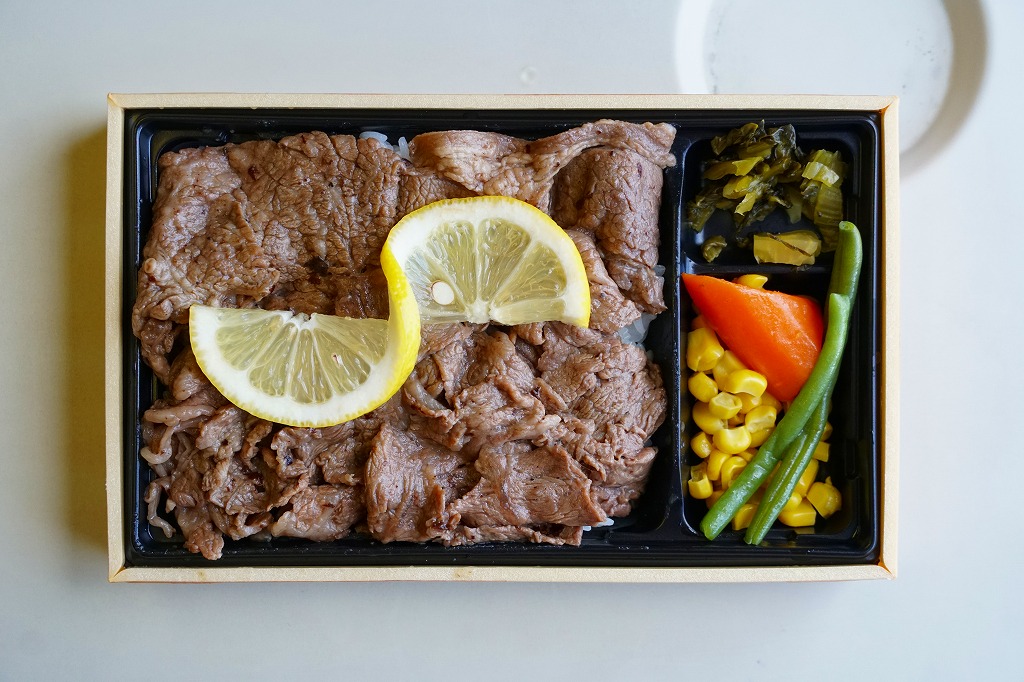 白飯を牛肉で覆い、高菜やコーンなどを付け合わせる。レモンのスライスを載せた肉そのものが、レモンの酸味をたっぷり含む。以前の駅弁屋の時代とは違う、肉をかなり硬めにした、レモンにまみれた焼肉弁当。