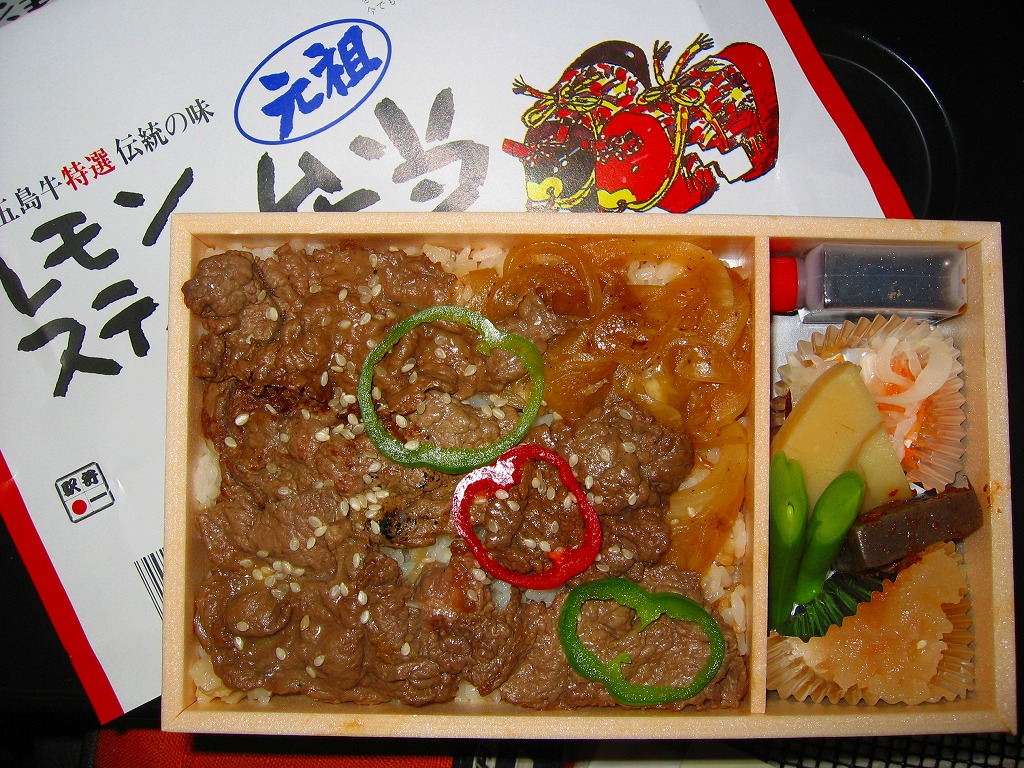 2005(平成17)年の新作駅弁と紹介されたが、1990年代にも売られていたはず。「レモンステーキ」そのものが、佐世保の食を紹介するうえで欠かせない名物である。長方形の容器に白飯を詰め、平戸・五島牛の焼肉で覆い、白ごまとピーマンとパプリカで彩り、煮物と酢の物を添える。