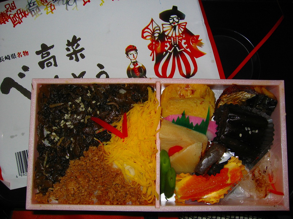佐世保駅で「レモンステーキ弁当」に次ぎ、「あごめし」に肩を並べた存在。正方形ふたつ分の容器の、一方に白飯を詰めてが高菜古漬油炒めと鶏そぼろと錦糸卵で覆い、他方に煮物や焼き魚や玉子焼などのおかずを詰める。九州の北半分ではありふれていて名物にもならない高菜を主題にした駅弁は珍しいと思うし、高菜の弁当で千円以上もするのかと損をしそうな存在。調製元の閉店により、2014年7月限りで終売した模様。