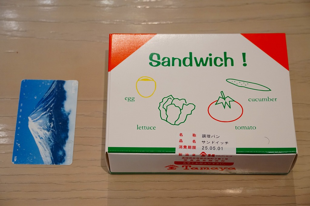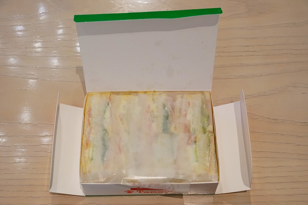 これは駅弁でなく、駅前弁当でもなく、佐世保市街のアーケード商店街にあるデパートで売られる惣菜。百貨店の名を記す専用の紙箱に薄い紙を敷き、キュウリとトマトとレタスとタマゴとハムを水気豊かなたっぷりさらさらのマヨネーズとともに耳なし食パンで挟んだサンドイッチを詰める。1963(昭和38)年からこの百貨店で売られているといい、佐世保のソウルフードとも紹介される、玉屋のサンドイッチ。昭和時代か家庭料理の、昔懐かしい柔らかさ。