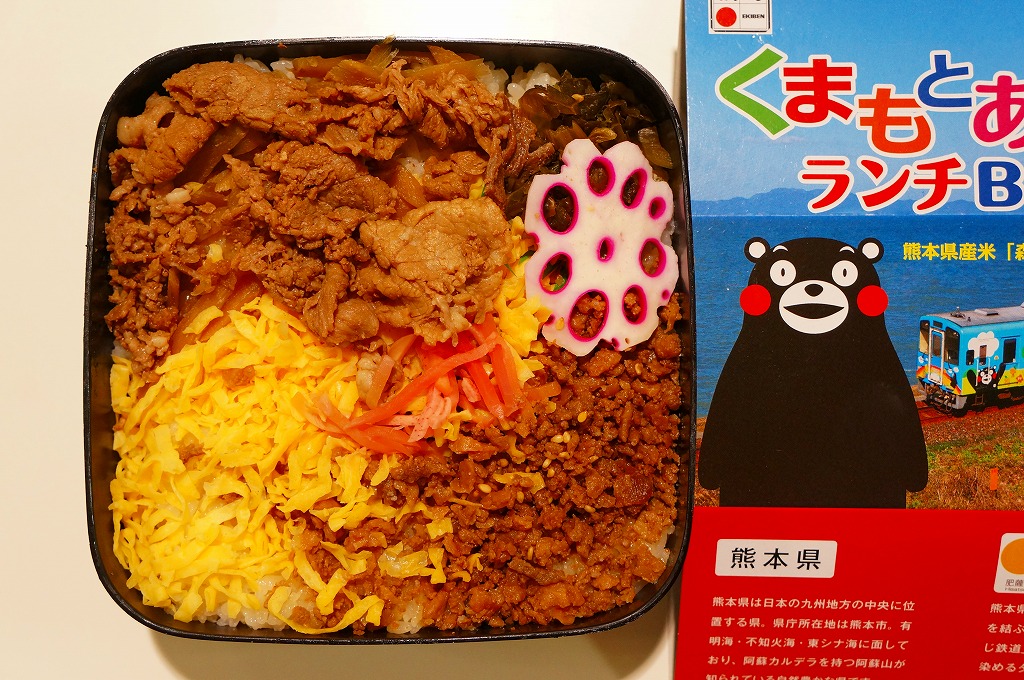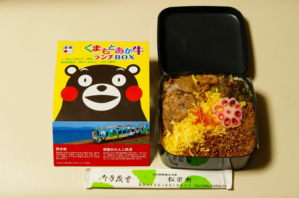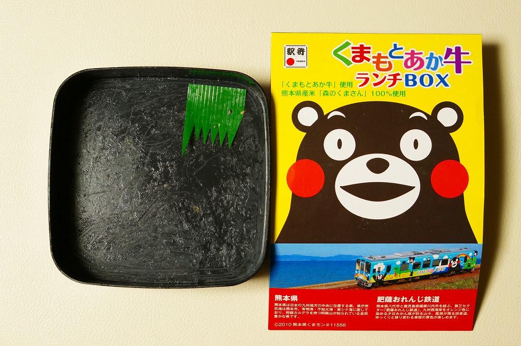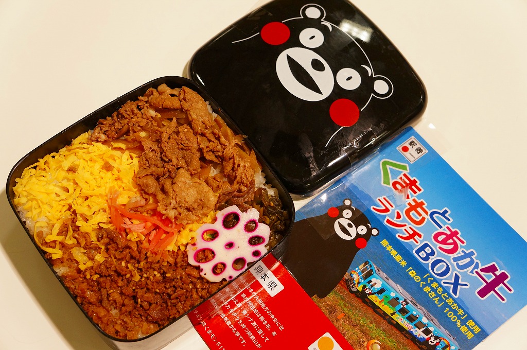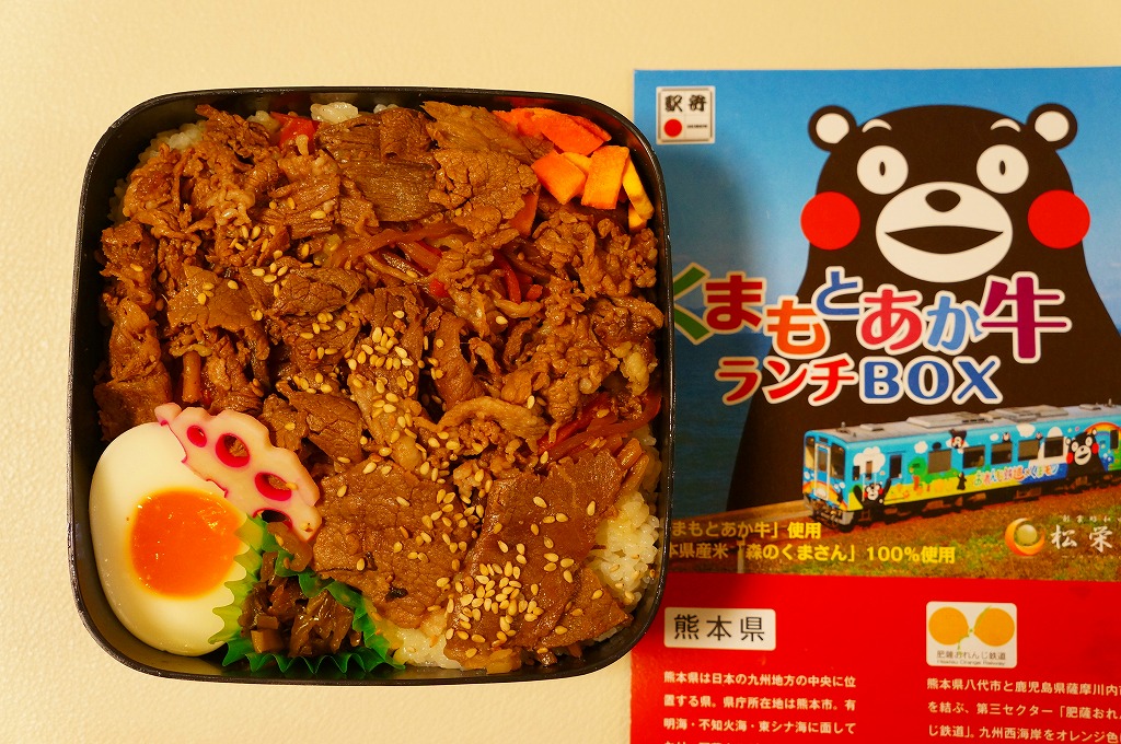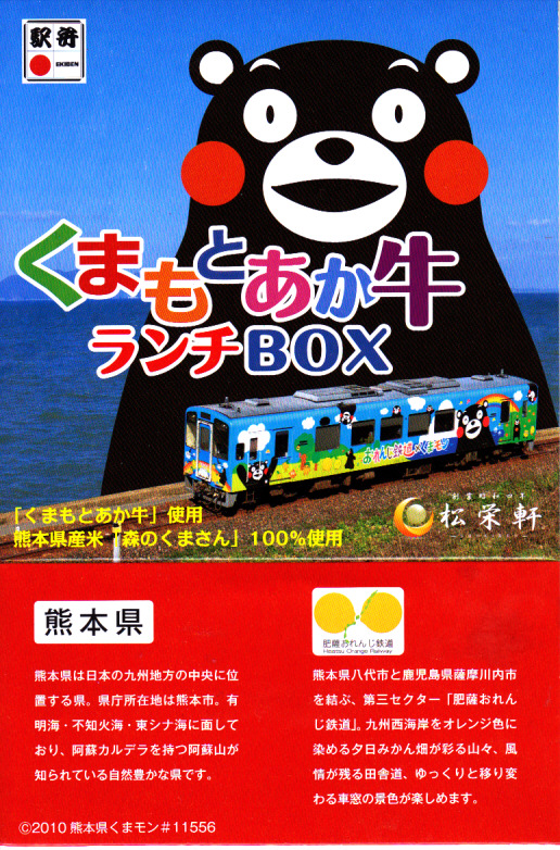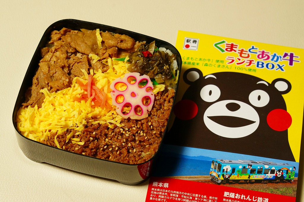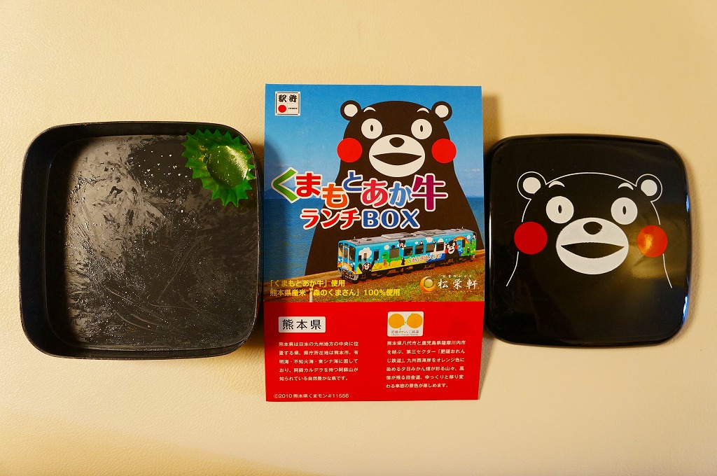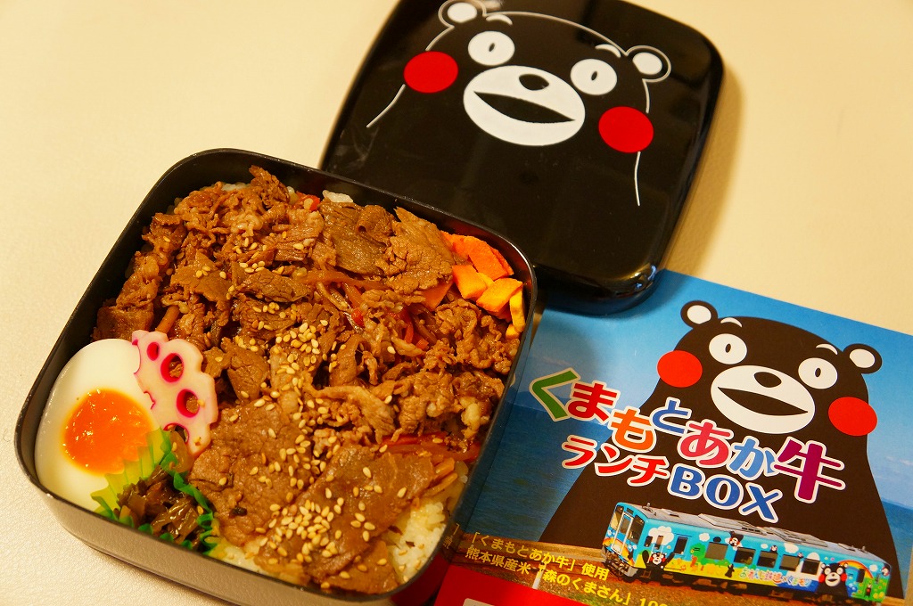 熊本県のキャラクター「くまモン」を描いた真っ黒なプラスティック製容器に、熊本県産米「森のくまさん」の味付飯を詰め、くまもとあか牛の牛肉煮で覆い、ゆで卵、レンコン酢漬け、きんぴらごぼう、高菜漬、ドライかぼちゃとドライにんじんを添える。つまり牛丼駅弁。輸送の影響か、飯も肉もパサパサで、褐毛和種の豊かな赤身の味はどこにもなかった。