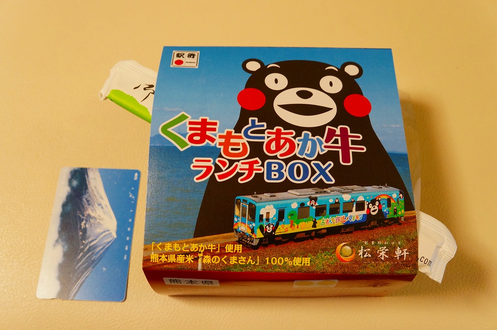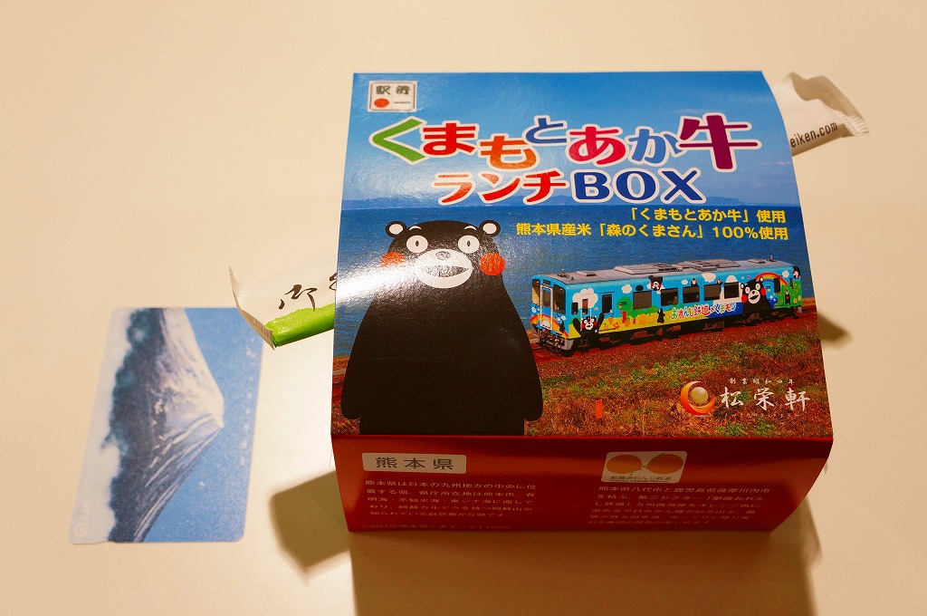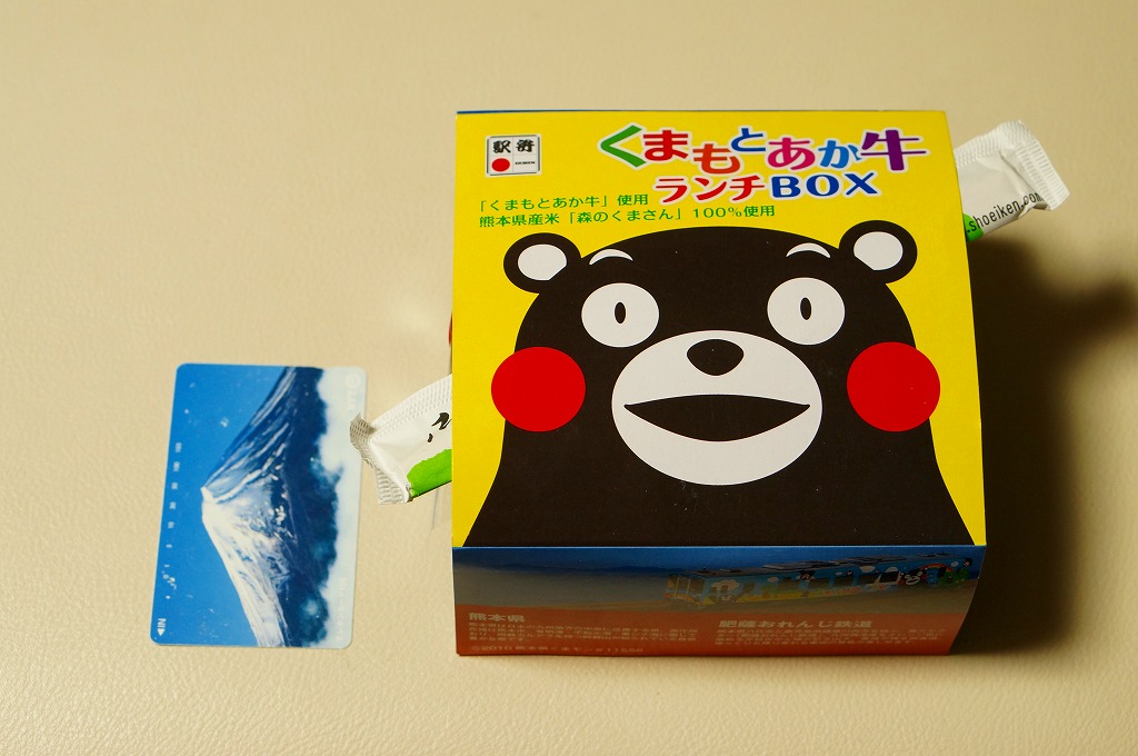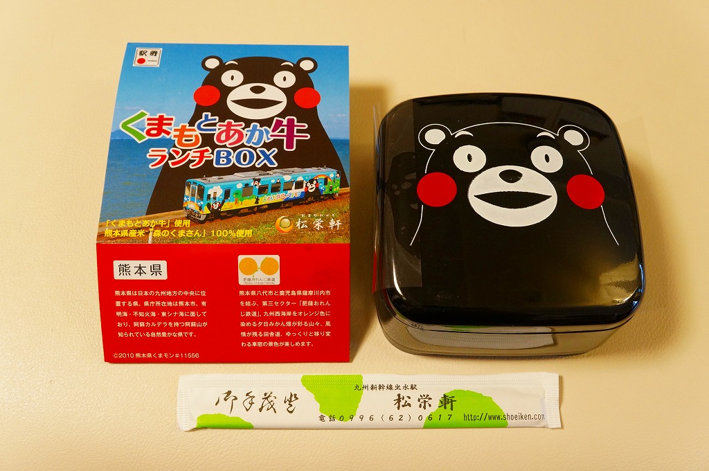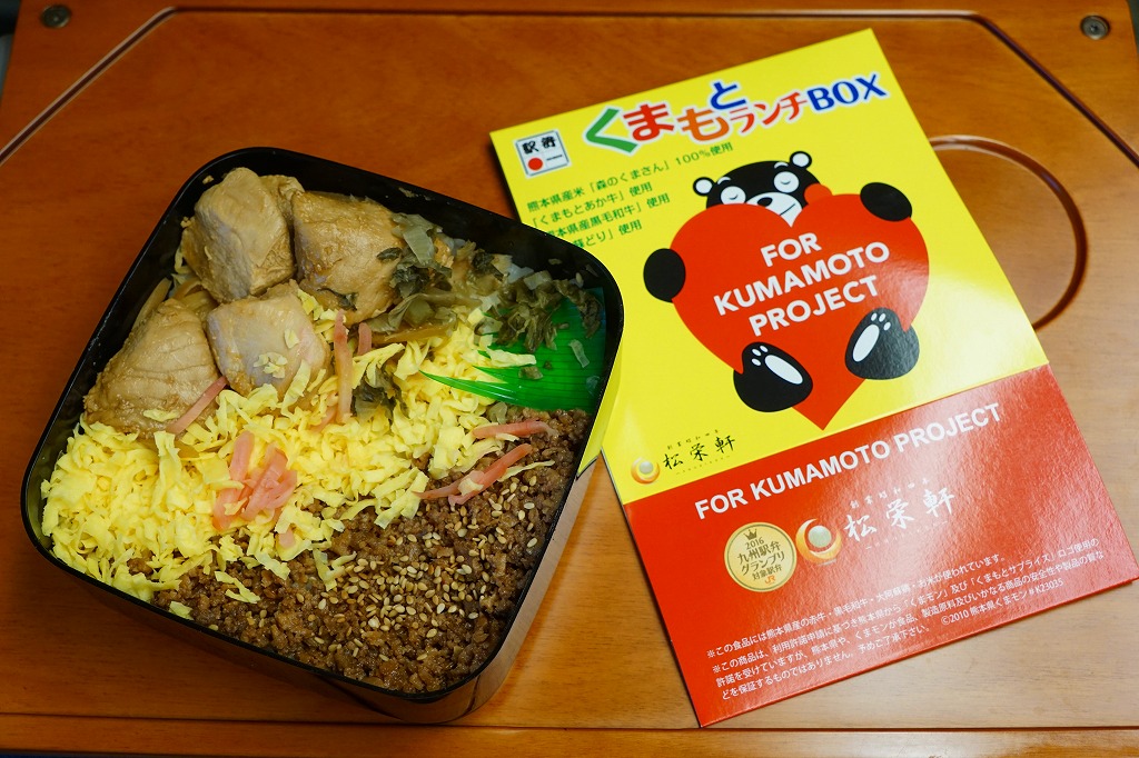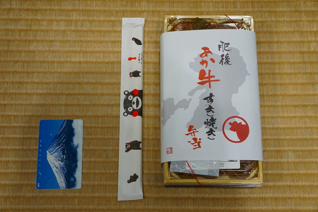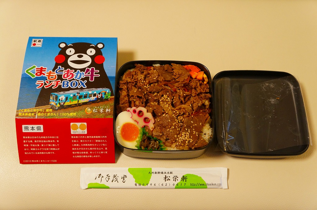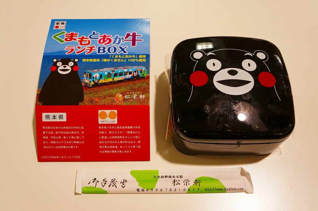 熊本県のキャラクター「くまモン」を描いた真っ黒なプラスティック製容器に、熊本県産米「森のくまさん」の味付飯を詰め、くまもとあか牛の牛肉煮で覆い、ゆで卵、レンコン酢漬け、きんぴらごぼう、高菜漬、ドライかぼちゃとドライにんじんを添える。つまり牛丼駅弁。輸送の影響か、飯も肉もパサパサで、褐毛和種の豊かな赤身の味はどこにもなかった。