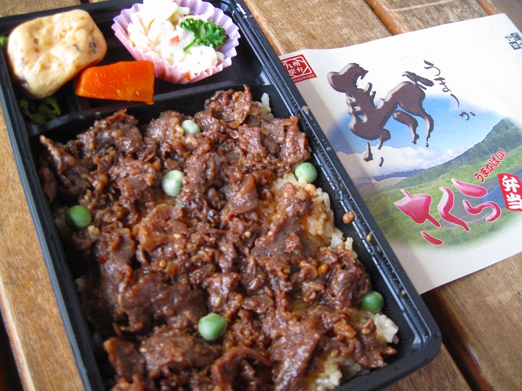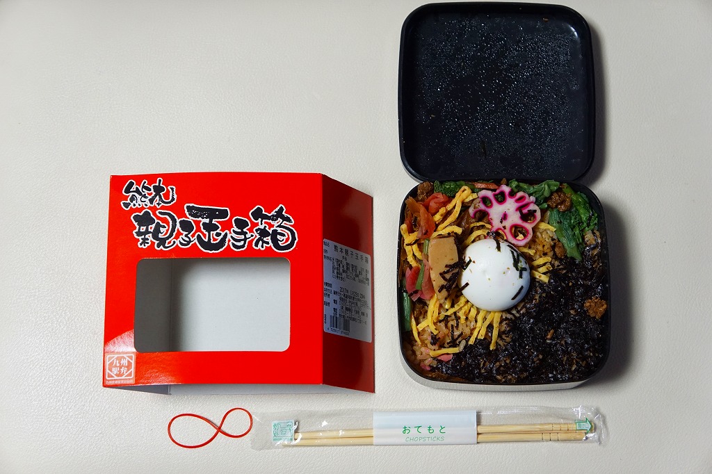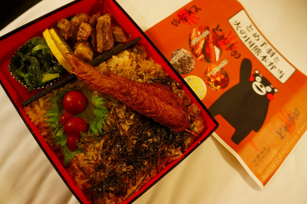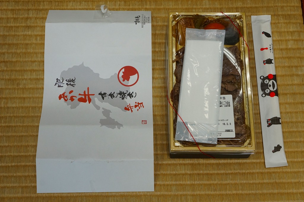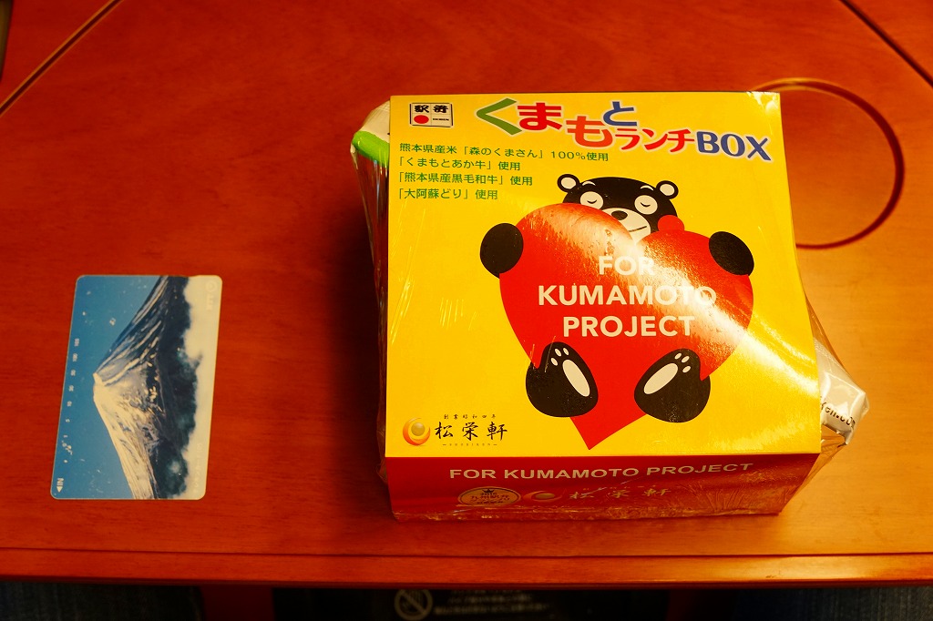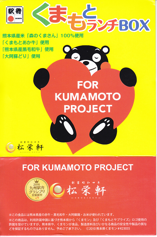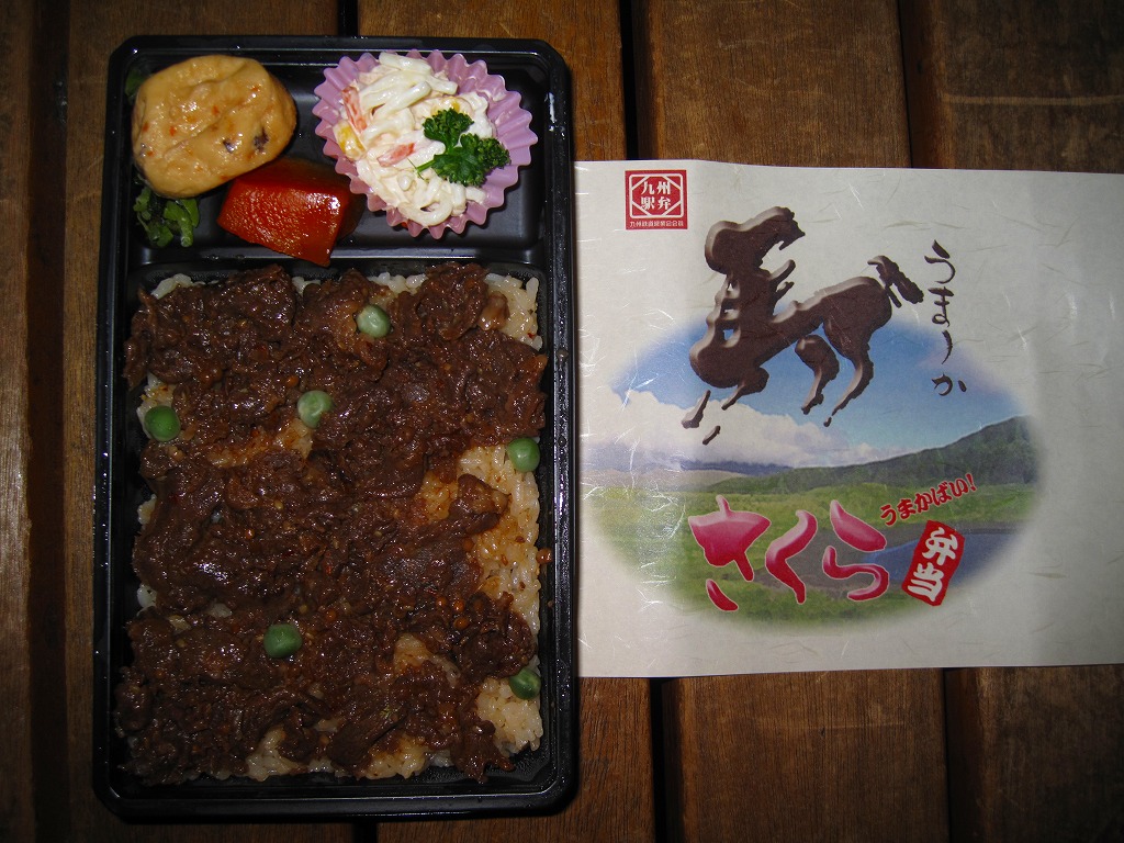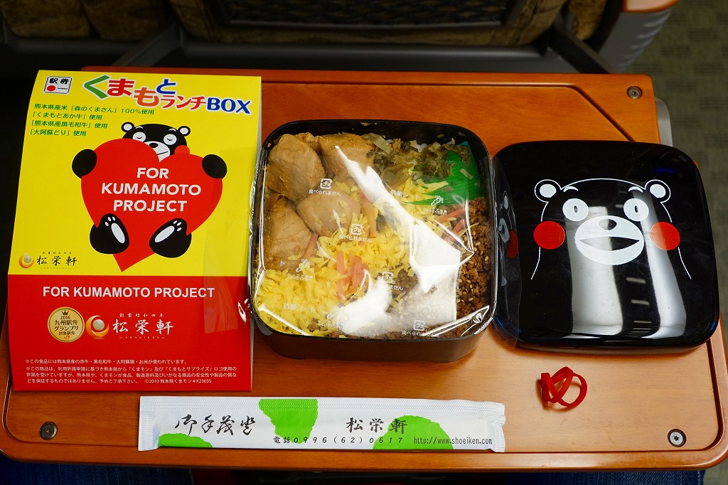 熊本県のキャラクター「くまモン」を描いた真っ黒なプラスティック製容器に、熊本県産米「森のくまさん」の味付飯を詰め、くまもとあか牛の牛肉煮で覆い、ゆで卵、レンコン酢漬け、きんぴらごぼう、高菜漬、ドライかぼちゃとドライにんじんを添える。つまり牛丼駅弁。輸送の影響か、飯も肉もパサパサで、褐毛和種の豊かな赤身の味はどこにもなかった。