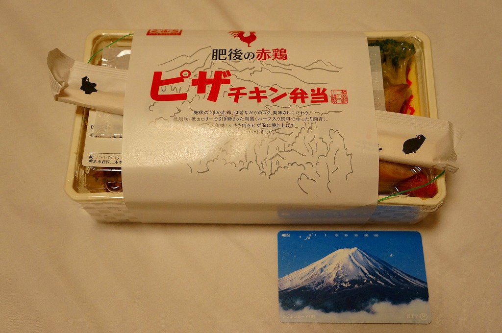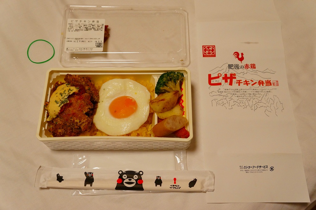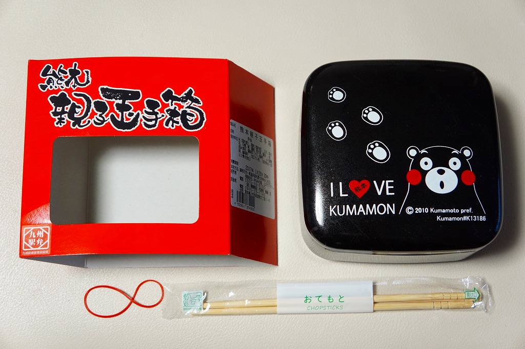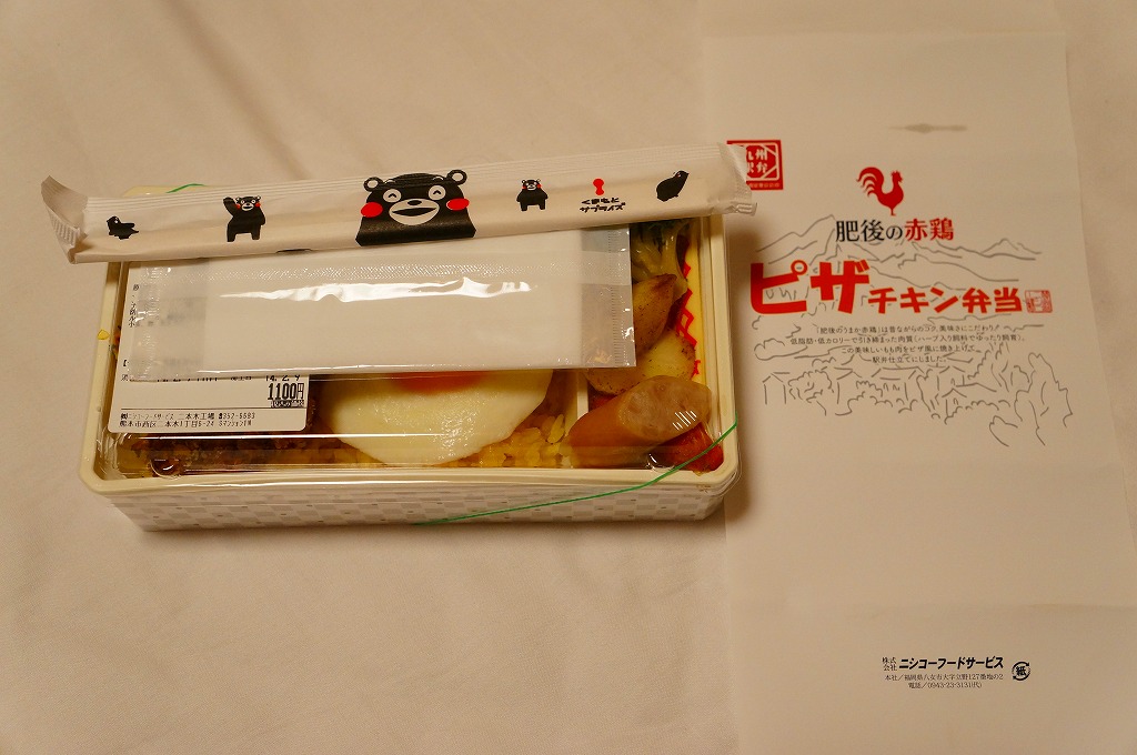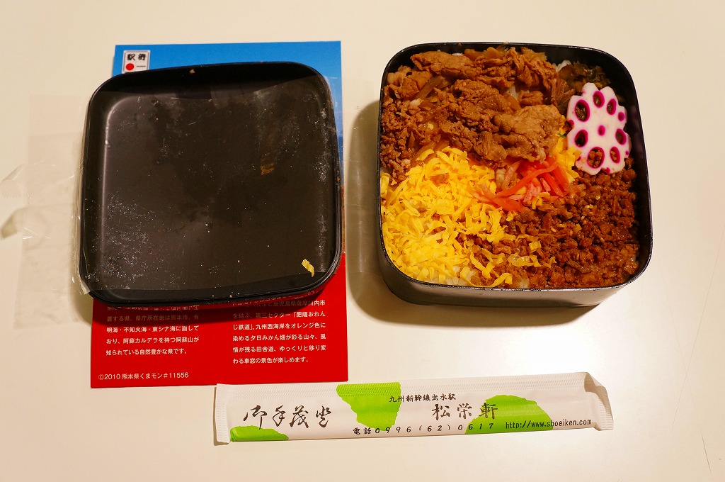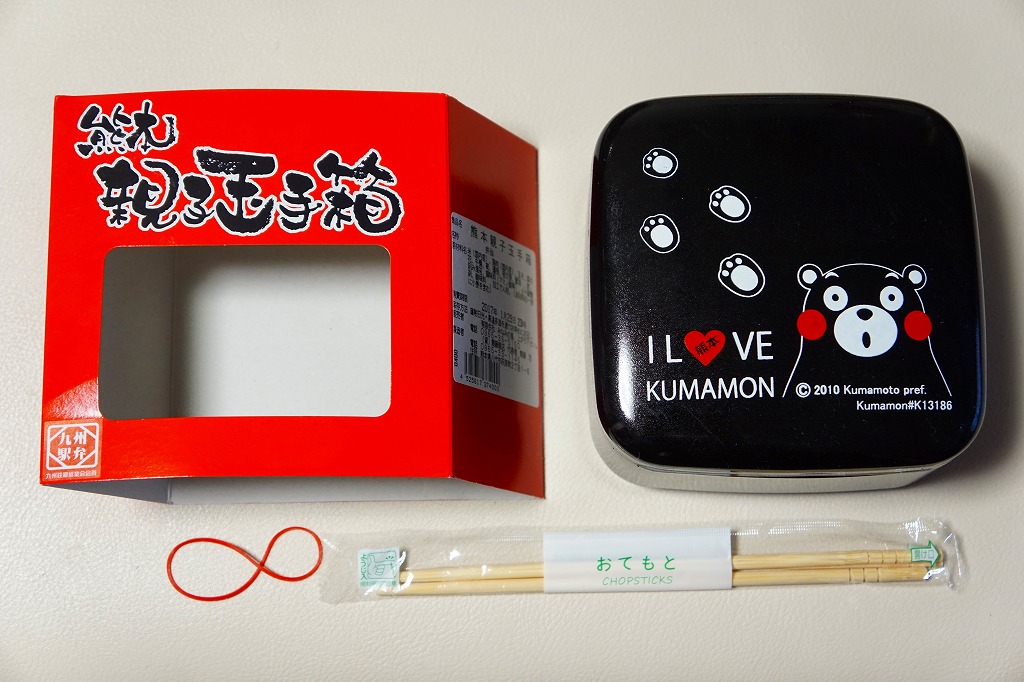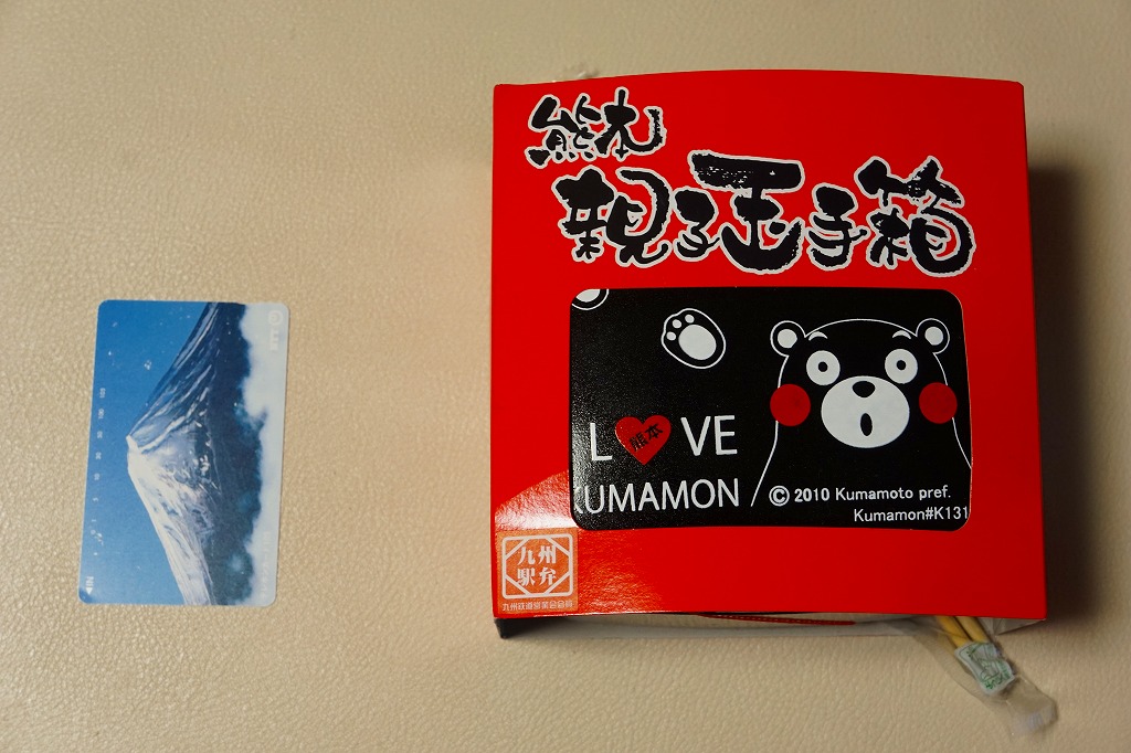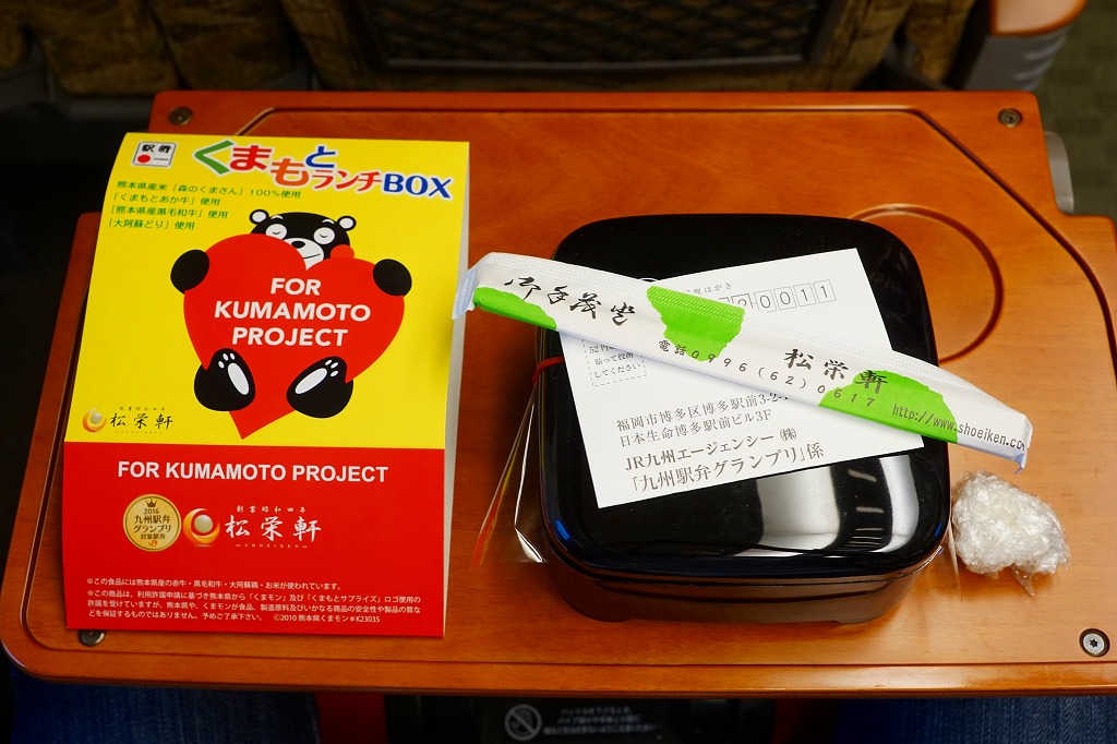 熊本県のキャラクター「くまモン」を描いた真っ黒なプラスティック製容器に、熊本県産米「森のくまさん」の味付飯を詰め、くまもとあか牛の牛肉煮で覆い、ゆで卵、レンコン酢漬け、きんぴらごぼう、高菜漬、ドライかぼちゃとドライにんじんを添える。つまり牛丼駅弁。輸送の影響か、飯も肉もパサパサで、褐毛和種の豊かな赤身の味はどこにもなかった。