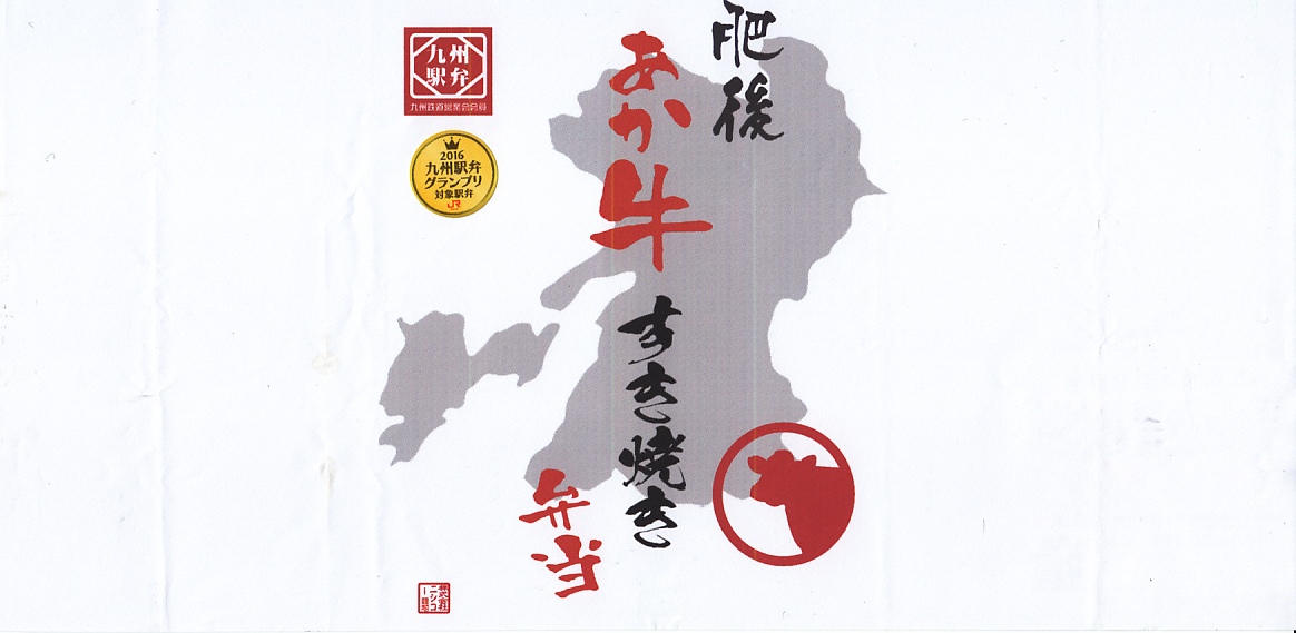 2016(平成28)年10月22日に購入した、熊本駅弁の掛紙。上記の1年半後と同じ。容器や中身や価格も同じ。当時の掛紙には、九州鉄道営業会「九州駅弁」と、JR九州「2016九州駅弁グランプリ」のロゴマークが貼られていた。