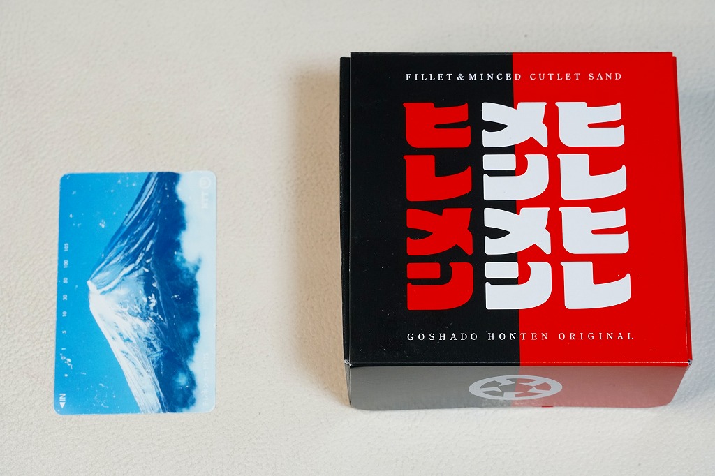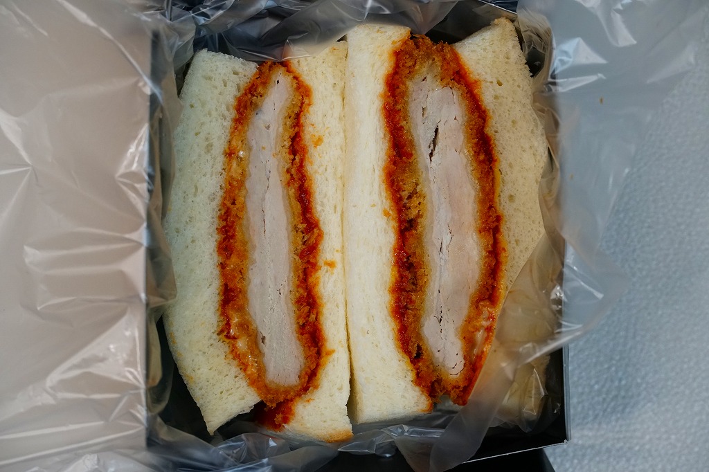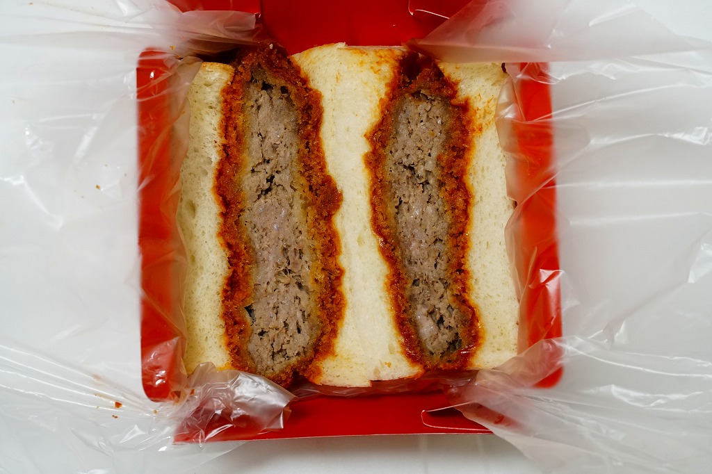 熊本駅のファミリーマートでは、2022(令和4)年5月までに発売か。熊本駅から徒歩2分のステーキとハンバーグのレストラン「五車堂」(ごしゃどう)のカツサンドが、熊本駅の駅弁売り場へ派手に進出した。商品名は赤文字の「ヒレメン」だろうか。英字で「FILLET&MINCED CUTLET SAND」、食品表示で「調理パン(ヒレカツサンド・メンチカツサンド)」とある。この黒と赤の紙箱に、ヒレカツとメンチカツのソース漬けを耳なし食パンで挟んだカツサンドが、1切れずつ収まる。このソースが、五車堂が創業以来70年以上にわたり大切に作り続けてきた秘伝なんだとか。価格は駅では630円、ネット通販や店舗で買うと540円。