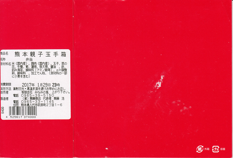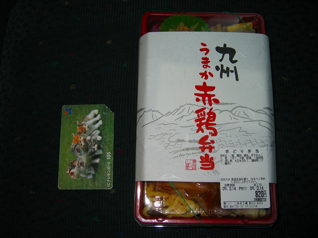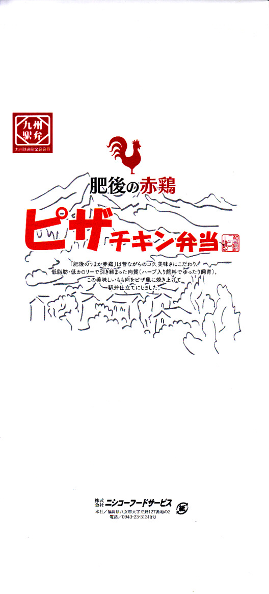 2008(平成20)年の10月までに発売。長方形のプラ製の惣菜容器に透明なふたをして輪ゴムで留め、商品名に阿蘇のような風景を描いた掛紙を巻き、テープと食品表示ラベルで留める。中身は茶飯の上を太い錦糸卵で覆い、鶏照焼のスライスをふんだんに載せて、辛子れんこん、切り干し大根、桜漬などを添えるもの。柔らかさと締まりが程良い、具だくさんでなかなかうまい鶏肉弁当。価格は2009年の購入時で820円、2016年時点で1,000円。