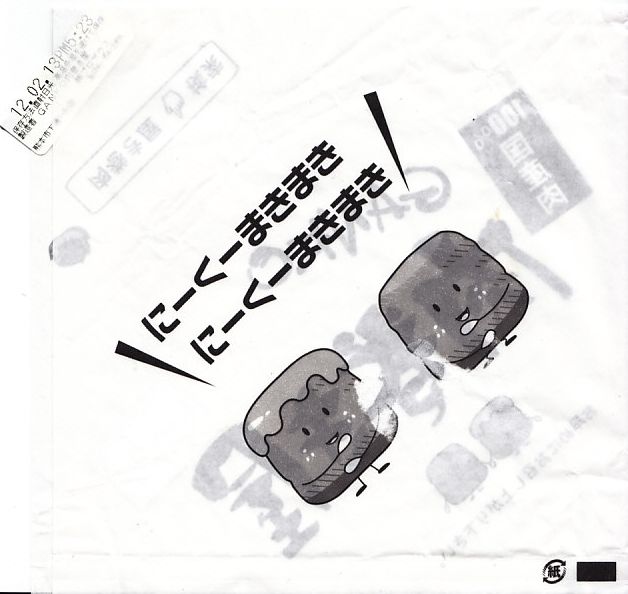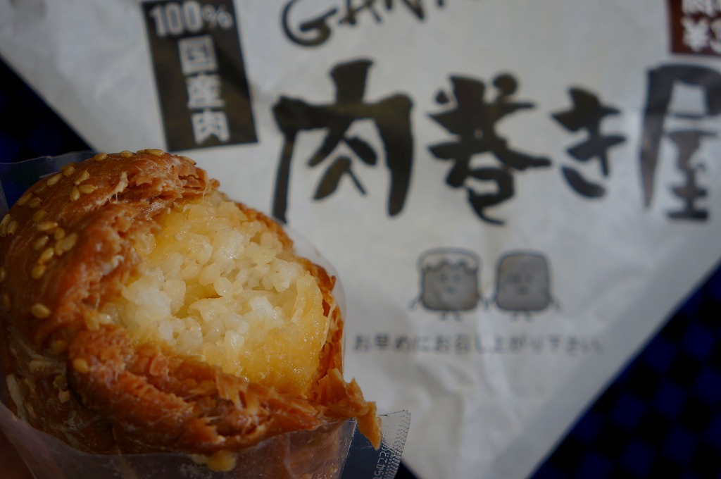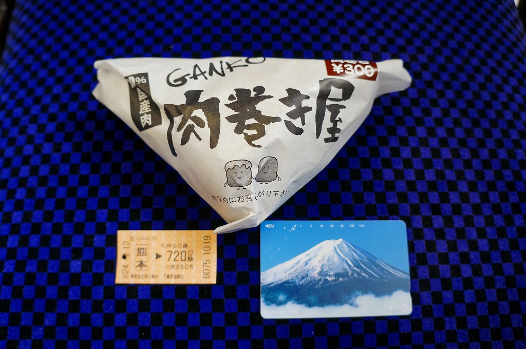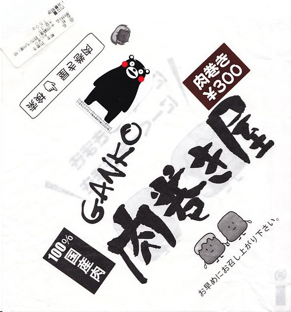 新幹線熊本駅の床置き形キヨスクで、八代駅の駅弁とともに売られた商品。この「肉巻き」が通常版で、他に売店では「大葉入り肉巻き」が300円で、「チーズ肉巻き」が350円で販売されていた。市販の肉まんやハンバーガーと同じような包装紙に、熊本県阿蘇産の白御飯を九州産の豚肉で目張りしたおにぎりが、真空パックで1個収まる。空弁でも何度か出会っている内容と味。包装紙に「くまモン」のシールまで貼り熊本をアピールするが、ブランドネームや商品そのものは神奈川や長野にもあるフランチャイズチェーンの製品。