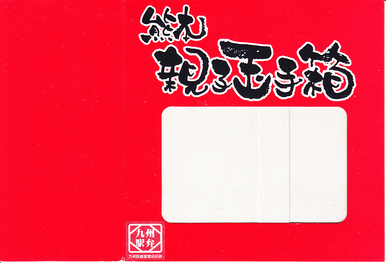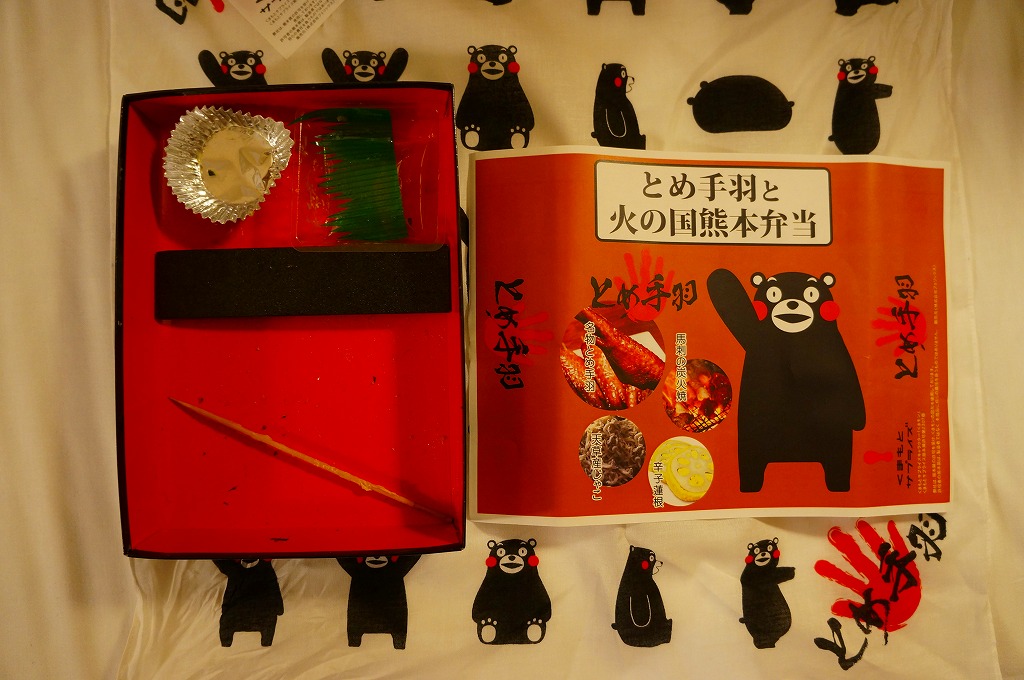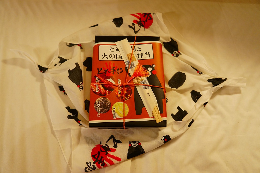 2012(平成24)年2月1〜14日に熊本県熊本市の鶴屋百貨店で開催された「第49回全国有名駅弁当とうまいもの大会」で、熊本駅の駅弁として先行実演販売されたお弁当。真っ黒なボール紙製容器に、熊本県のキャラクター「くまモン」や中身のイメージ写真を印刷した掛紙をかけ、くまモンの風呂敷で包む。中身は茶飯の上に刻み海苔を振り、串で棒状に伸ばした鶏手羽肉「とめ手羽」をひとつ置き、馬肉炭火焼、からしれんこん、高菜漬などを添えるもの。