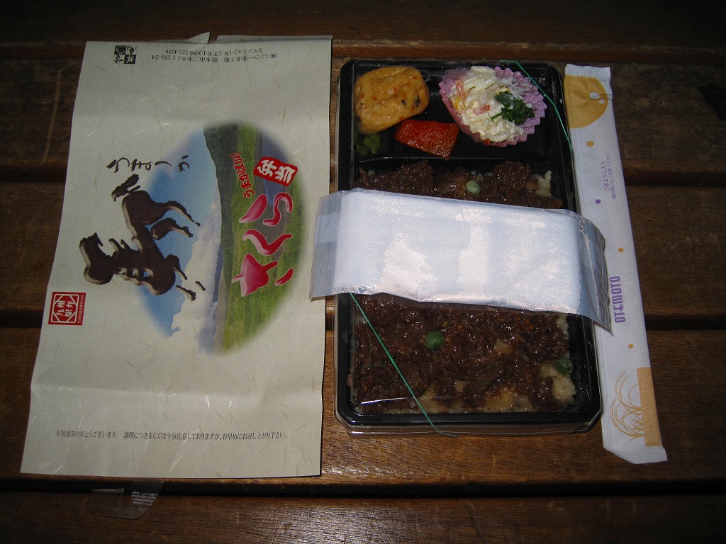 黒いトレーを接着した容器に透明なふたをして、草原の風景と馬の漢字を模した馬などを描いた掛紙で巻く。中身は御飯の上に焼いた馬肉を敷き詰めてグリーンピースを振り、パスタサラダ、ニンジン煮、がんも煮、高菜刻みを添えるもの。