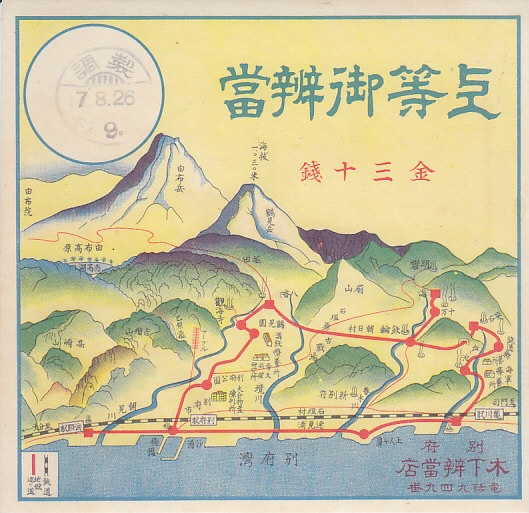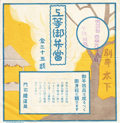 記載事項から1937(昭和12)年のものと思われる、昔の別府駅弁の掛紙。掛紙の大きさは異なるが、絵柄は上記の「上等御辨當」と同じ。