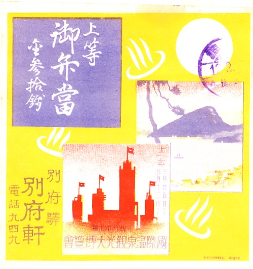 記載事項から1937(昭和12)年の調製と思われる、昔の別府駅弁の掛紙。別府湾と高崎山の風景に、1937年3月から5月まで別府公園で開催された国際温泉観光大博覧会のシルエットを描いた。