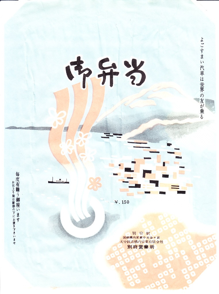 1963(昭和38)年6月6日(木)7時の調製と思われる、昔の別府駅弁の掛紙。絵柄は下記のものと同じ。べっぷを4度もひらがなで繰り返す、不思議な絵柄。