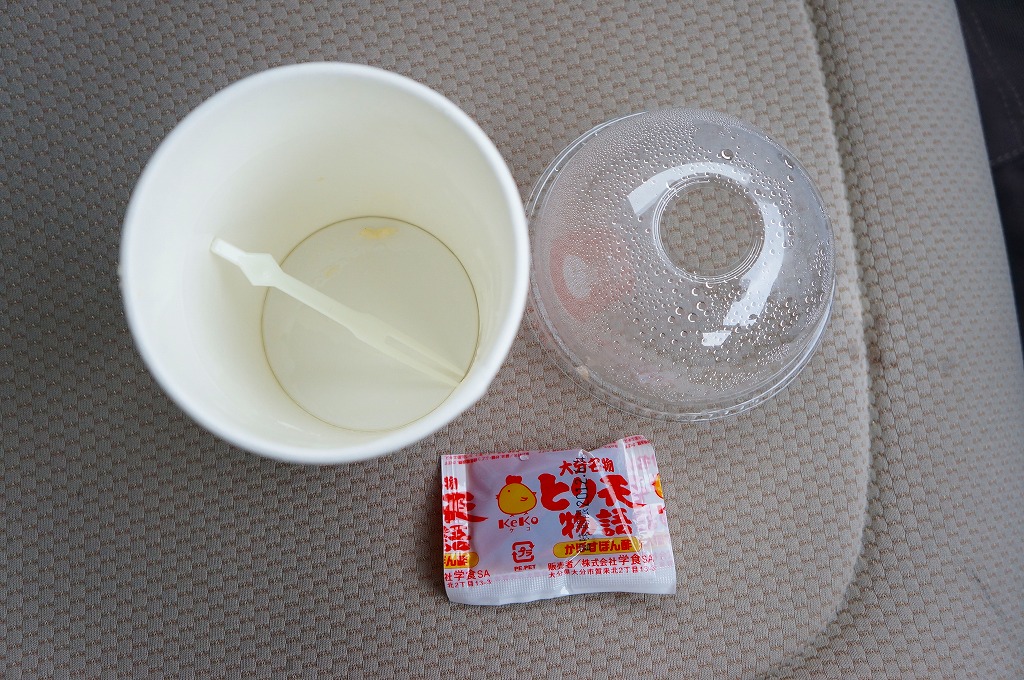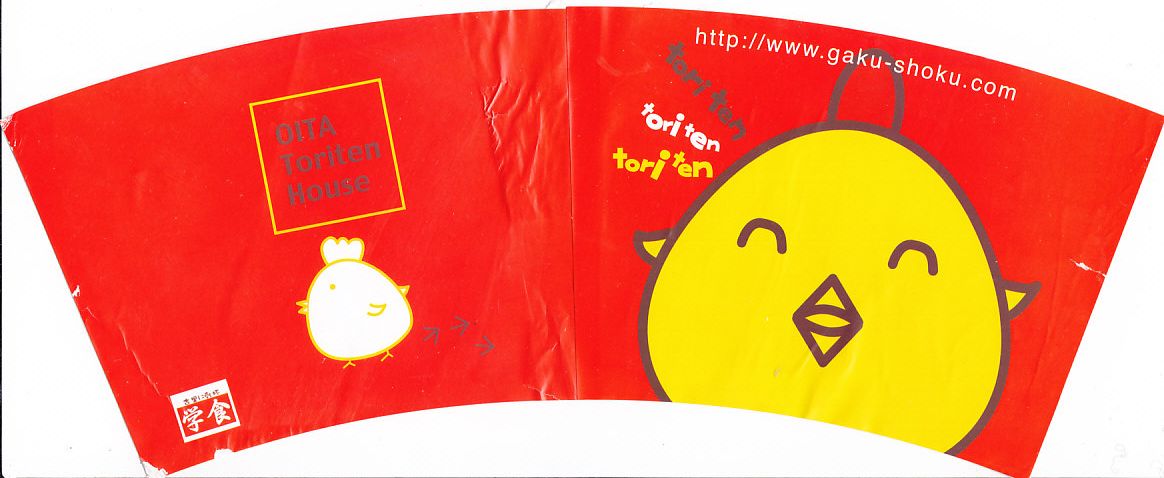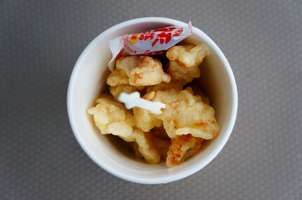 大分限定の名物「とり天」の、駅で買えたパッケージ。小鳥かニワトリを描いた赤い紙製カップの中に、鶏肉に小麦粉ベースと思われる衣を厚めに付けた小柄な天ぷらがゴロゴロと詰まり、ポン酢の袋が添えられる。味は見た目に違いかなりあっさりしており、とてもお手軽なファストフード。