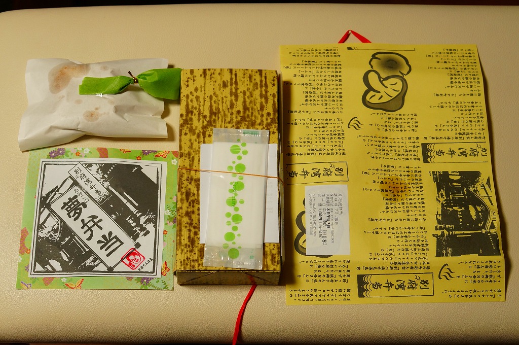 2006(平成18)年1月28日に購入した、別府の駅弁の掛紙。掛紙の背景としての和紙の絵柄のみが異なり、容器も中身も味も名前も同じ。