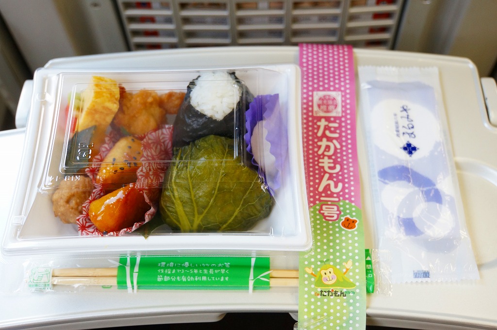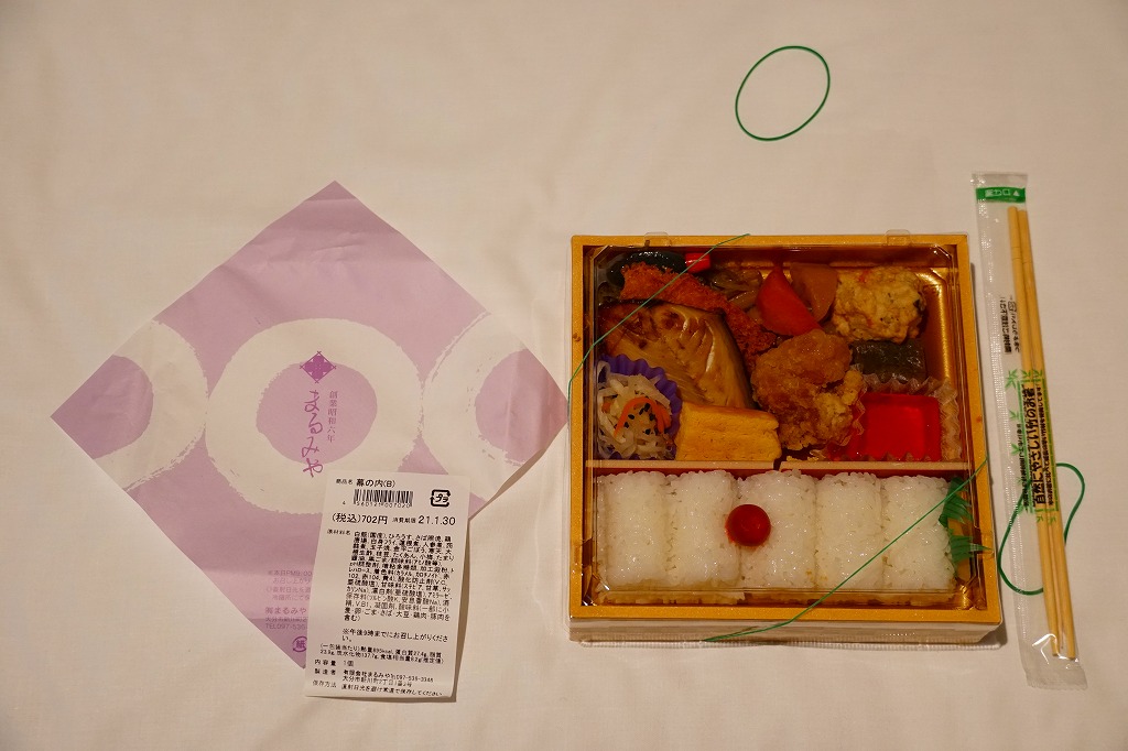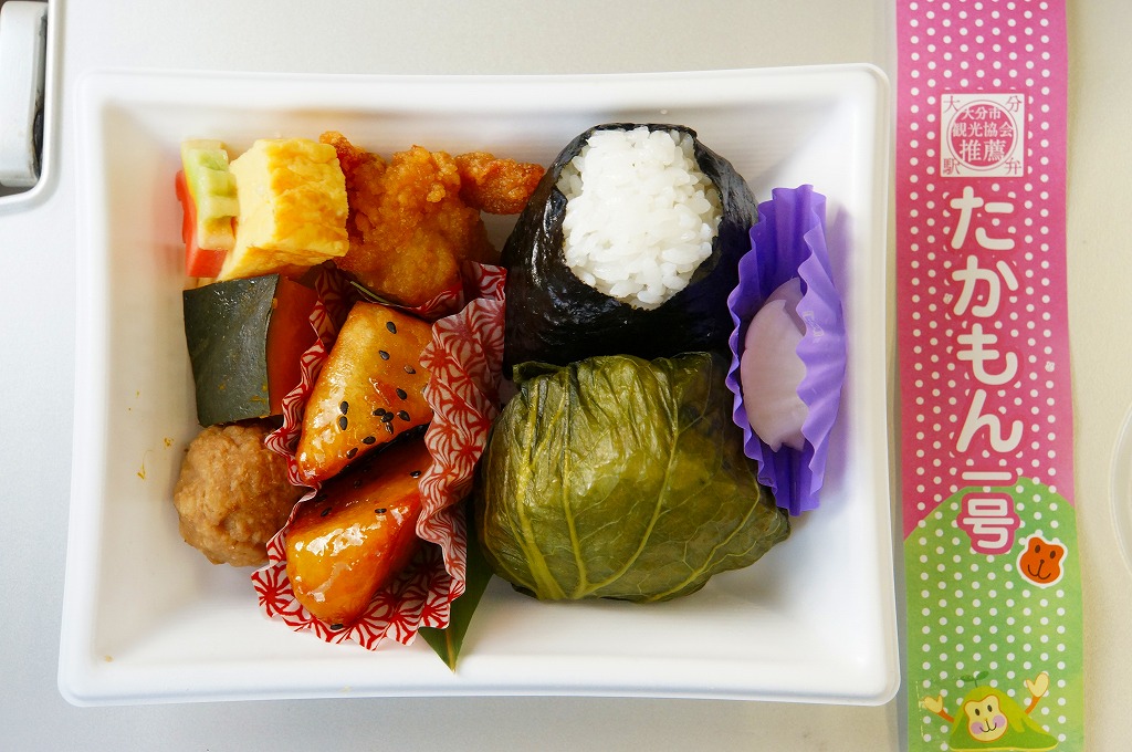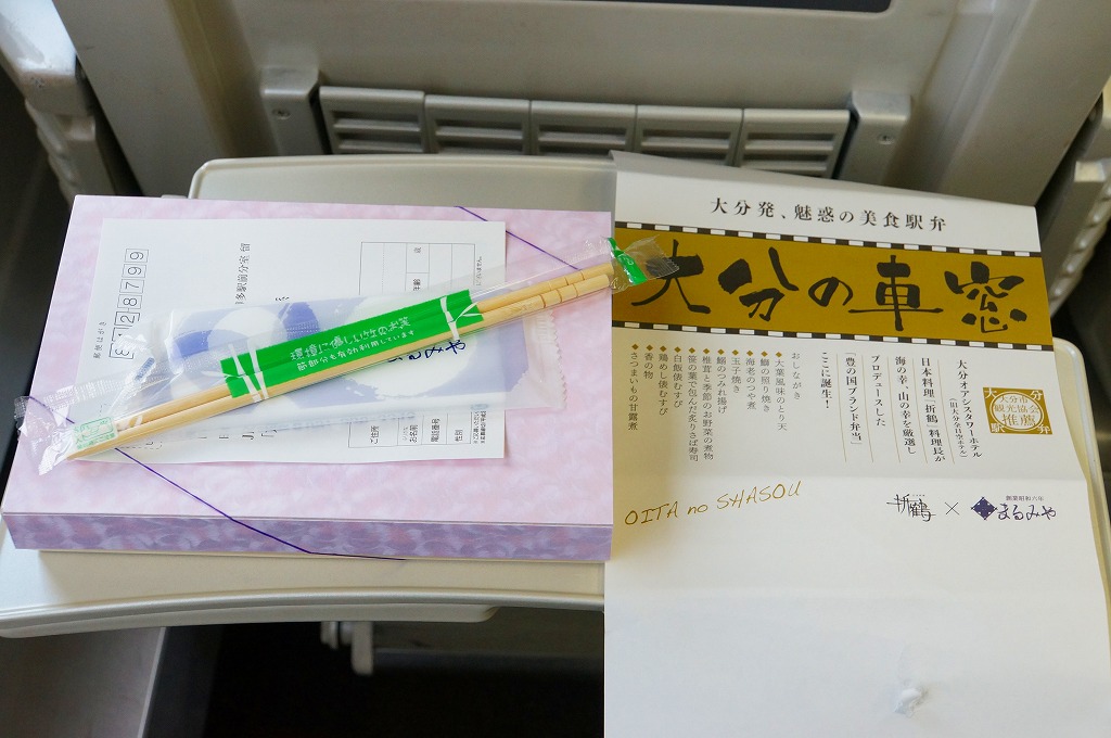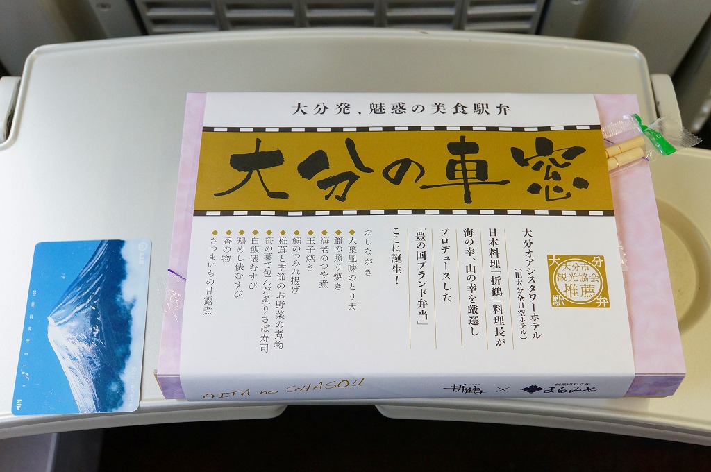 中身と大分や車窓が結びつかないと思うが、いろんなおかずが楽しめる美しいお弁当。ネット上の宣伝文によると、鶏飯とシイタケと漬物とブリなどが大分で、弁当箱の枠が車窓なのだそうな。調製元は大分市内の仕出し弁当屋。価格は2013年の購入時で1,000円、2014年4月の消費税率改定で1,029円。2016年頃までの販売か。