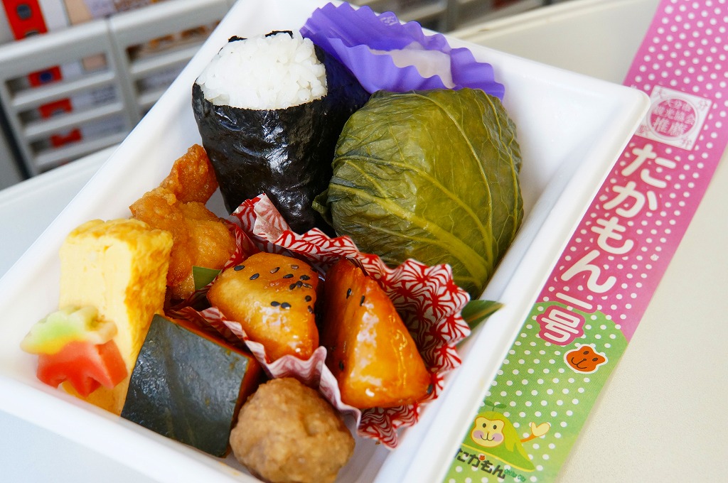 大分市の誕生100周年を記念して、2012(平成24)年3月17日に「大分の車窓」(1,000円)とともに発売。大分市観光協会とJR九州との共同開発だそうな。スーパーの惣菜向けのプラ容器に、高菜巻にぎり、海苔巻にぎり、鶏唐揚、玉子焼、大学芋、カボチャ煮、肉団子などを詰める。見た目では駅弁に見えないが、紙帯にはちゃんと「大分駅弁」と書いてある。たかもんとは大分県大分市の高崎山自然動物園のキャラクターで、園内のサル山とサルにちなむものらしい。「一号」が付いた理由は分からない。調製元は大分市内の仕出し弁当屋。2014年までにはなくなっていた模様。