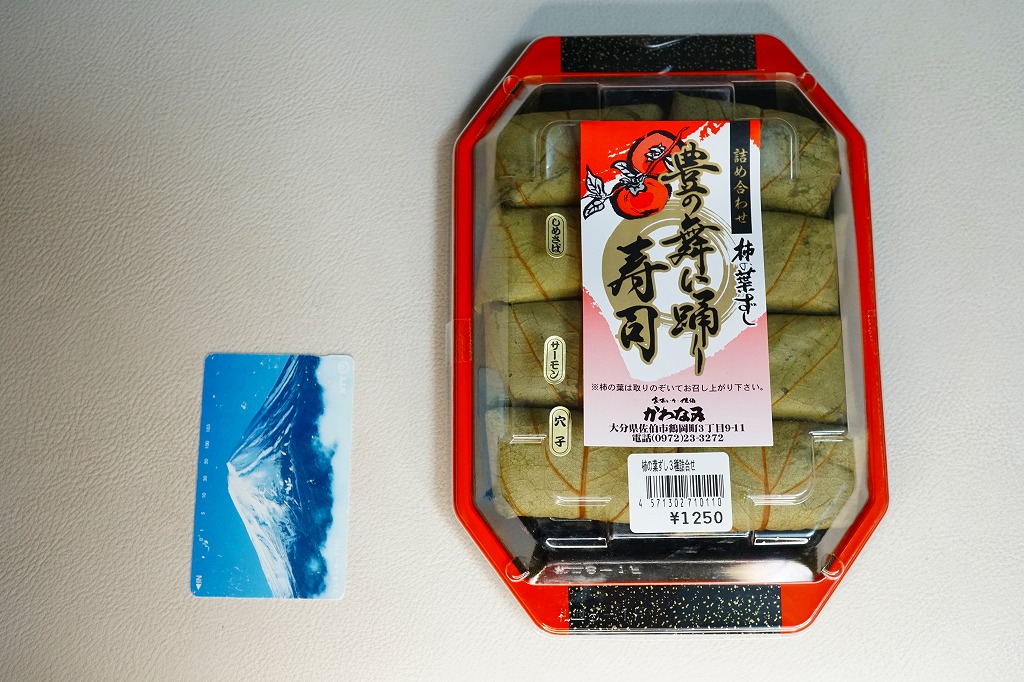 大分駅と別府駅の駅弁売り場で買える柿の葉寿司。惣菜向けプラ容器に、酢飯にサバの切り身を貼り柿の葉で巻いたものを5個並べ、商品名と価格と食品表示のシールを貼る。全国で売られても奈良や吉野やその周辺の名物や郷土料理とされる柿の葉寿司と同じものが、大分と宮崎の県境でも、あるいは大分県佐伯市でも名物を名乗り、またはこの調製元「かわなみ」の柿の葉ずしが人気となり、大分の鉄道駅や空港や道の駅などでも売られる。普通においしいサバの柿の葉寿司。