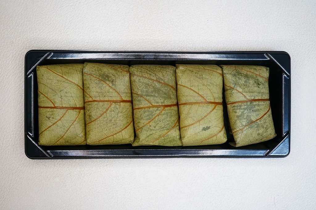 大分駅と別府駅の駅弁売り場で買える柿の葉寿司。惣菜向けプラ容器に、酢飯にアジの切り身を貼り柿の葉で巻いたものを5個並べ、商品名と価格と食品表示のシールを貼る。全国で売られても奈良や吉野やその周辺の名物や郷土料理とされる柿の葉寿司と同じものが、大分と宮崎の県境でも、あるいは大分県佐伯市でも名物を名乗り、またはこの調製元「かわなみ」の柿の葉ずしが人気となり、大分の鉄道駅や空港や道の駅などでも売られる。崩れや酸味のない、身が小さくても締まりと新鮮さを感じる、おいしいアジの柿の葉寿司。
