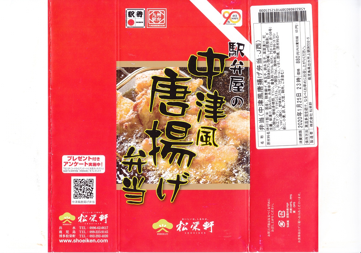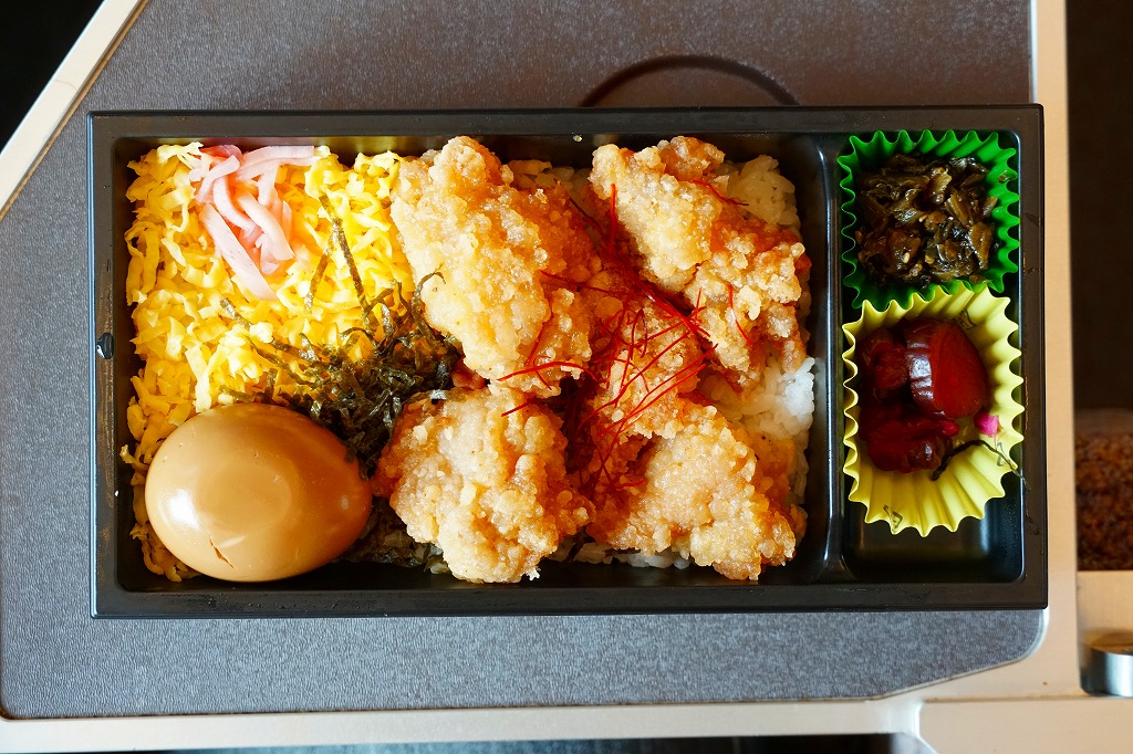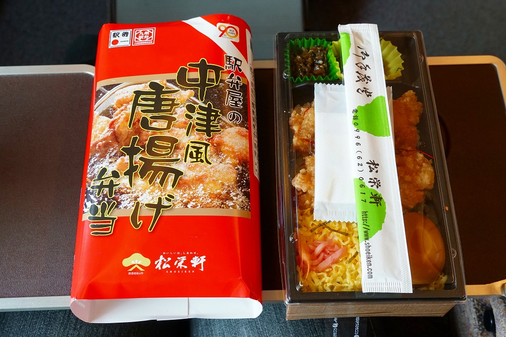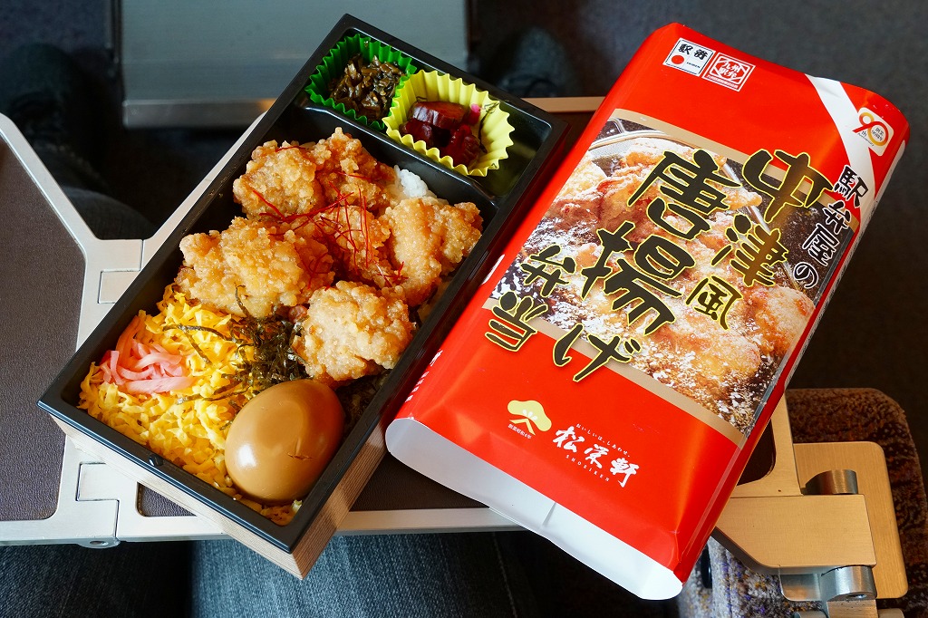 2018(平成30)年の秋に新大阪駅で発売か。鹿児島県の松栄軒の駅弁は、大分駅でも販売されているというから、これは大分駅の駅弁でもあるのだろうか。白御飯を錦糸卵や刻み海苔、駅弁にしては大きめの鶏唐揚や煮玉子で覆い、高菜と柴漬けを添える。唐揚げ弁当は駅弁には多くないが、これは衣が色も厚みも薄く、唐揚げというよりは竜田揚のような軽さを持つ。衣でなく肉に味を付けることが、中津からあげの特徴だという。大分県中津市には不思議と鶏唐揚屋が多かったそうで、21世紀になってからこれを「中津からあげ」と名付け、宣伝されるようになった。この駅弁が大分駅で現存するかは不詳。