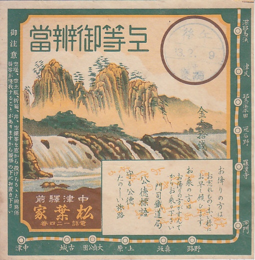 1938(昭和13)年2月9日の調製と思われる、昔の中津駅弁の掛紙。右や下の路線図は当時の耶馬渓鉄道のものであり、描いた風景も耶馬渓のものだろうか。