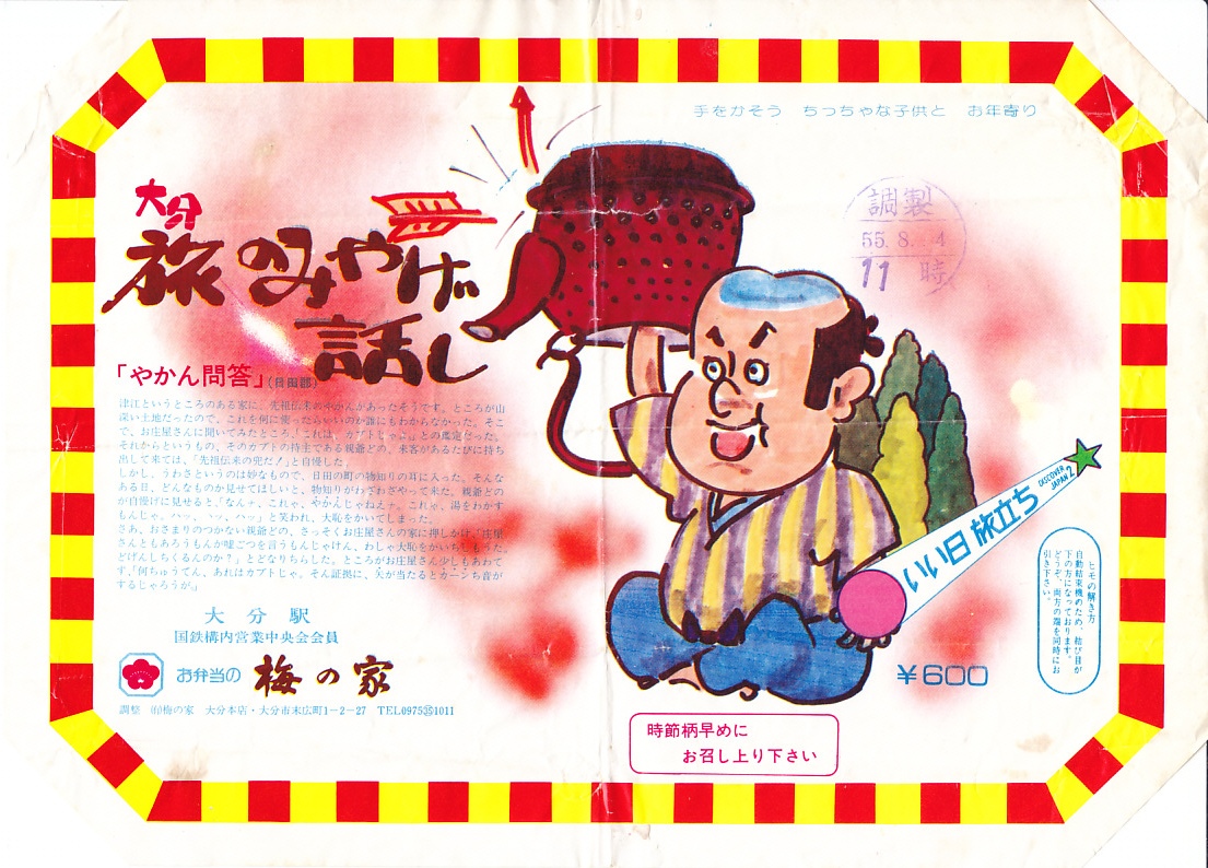 1980(昭和55)年8月4日11時の調製と思われる、昔の大分駅弁の掛紙。駅弁の名前にした旅のみやげ話のとおり、大分県日田郡の民話「やかん問答」とそのイラストを記す。民話を記す駅弁の掛紙が珍しいわけではないが、当時の大分県では平松守彦大分県知事の提唱による、県内すべての市町村でひとつ以上の特産品を用意して地域おこしという「一村一品運動」が実施され注目を集め始めた頃なので、そんなことを思い出させてくれる絵柄に見えた。