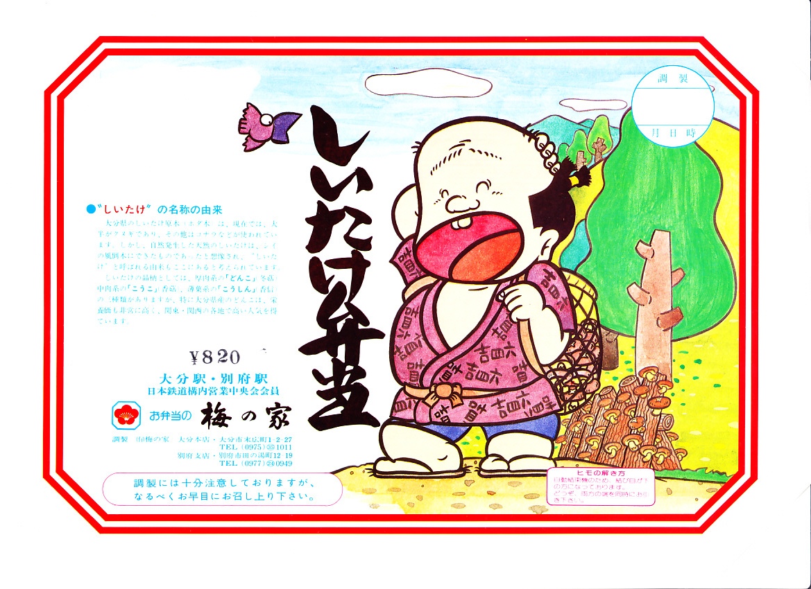 1994(平成6)年に開催された「しいたけ弁当コンクール」の作品をもとに、大分駅の駅弁屋が商品化したもの。正方形3つ分の細長い容器を使用、中身は左に梅花型の椎茸御飯、右に椎茸の軍艦巻きが3個、中央に唐揚げや卵焼きや昆布等のおかずを配置する、椎茸づくしの内容。2007(平成19)年11月の駅弁業者の撤退により終売となったと思われる。