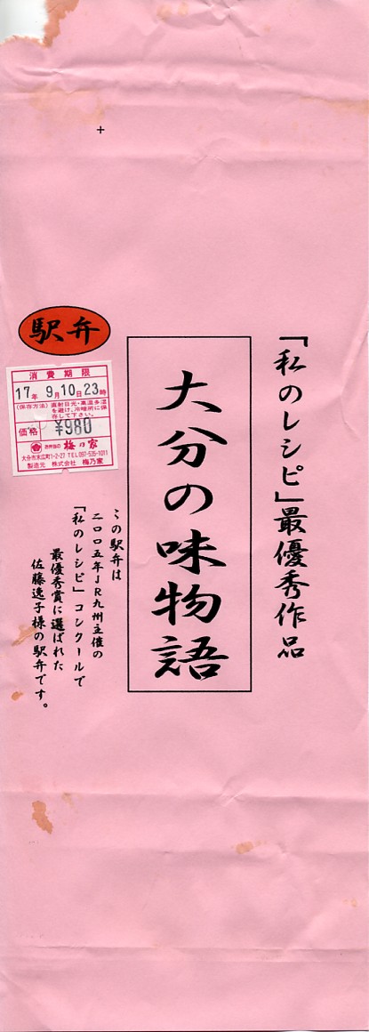 この駅弁は2005(平成17)年「九州の駅弁ランキング第2弾」の駅弁ラリーで全50種の収集を目指すため、その対象の大分駅弁を4種まとめて別府駅受取で予約購入したものだが、売店取り置きではなく調製元係員の直接持参手渡しとなっていて、びっくりした。