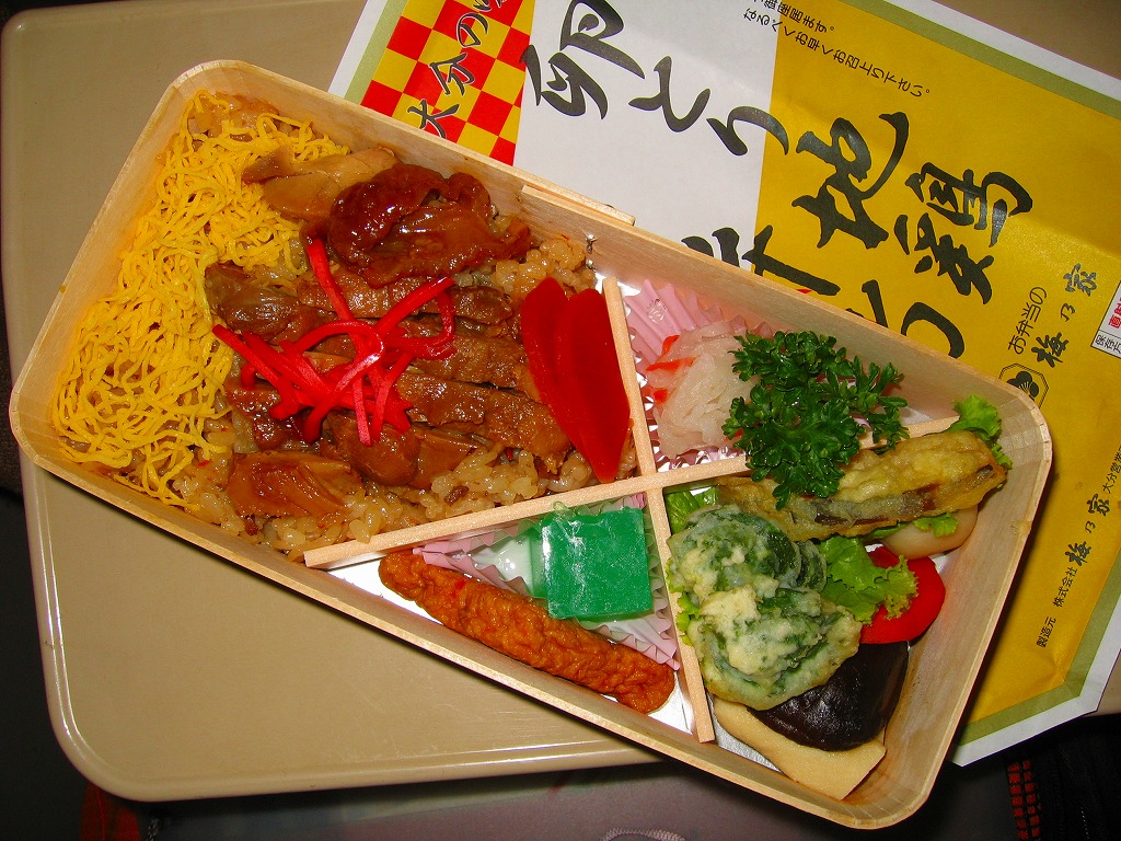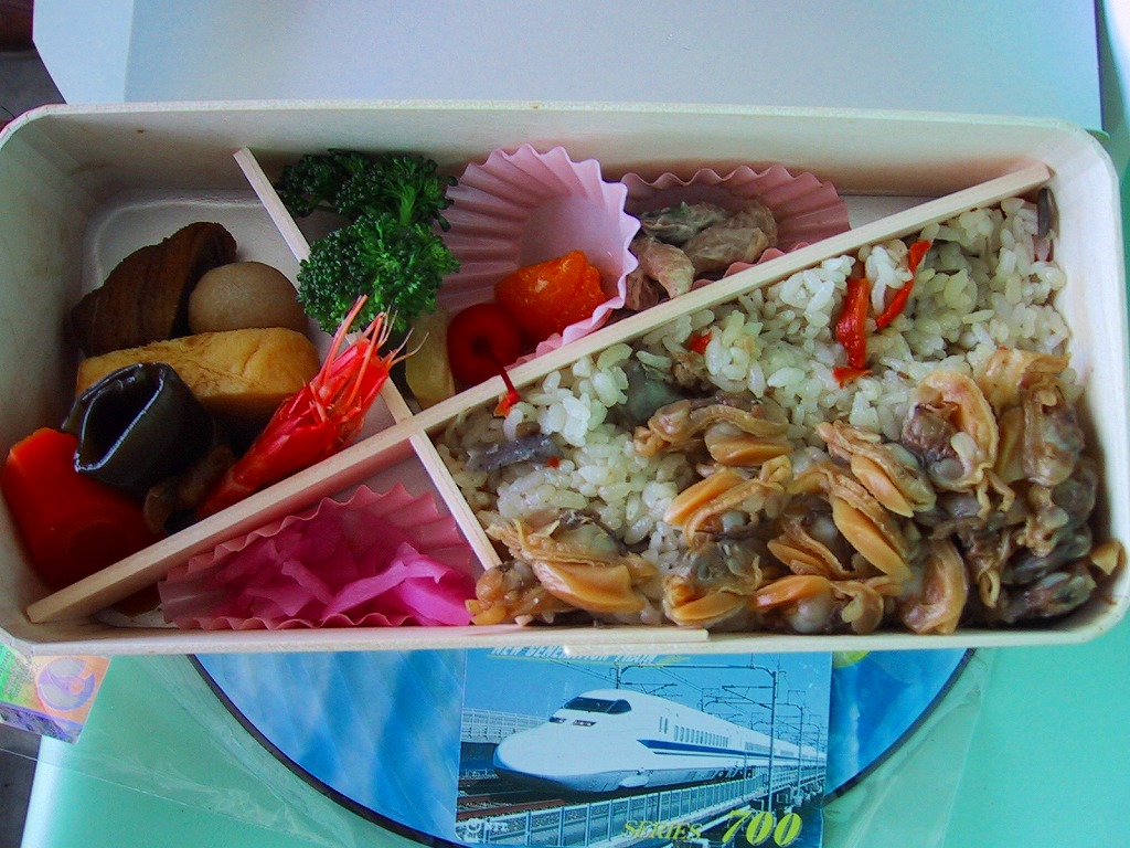 「梅の家特選季節弁当」と書いてあり、夏季限定の駅弁だろうか。あさり弁当ということで、掛紙にはアサリを描く。中身は五目飯にアサリ煮を載せ、有頭海老などの煮物に玉子焼や漬物などを添えたもの。この駅弁は大分で実施されたワールドカップサッカーの決勝トーナメント1回戦の観戦前に購入し、競技場の中で食べた。入場料はこの駅弁約40個分もした。2007(平成19)年11月の駅弁屋の撤退により、終売となったと思われる。