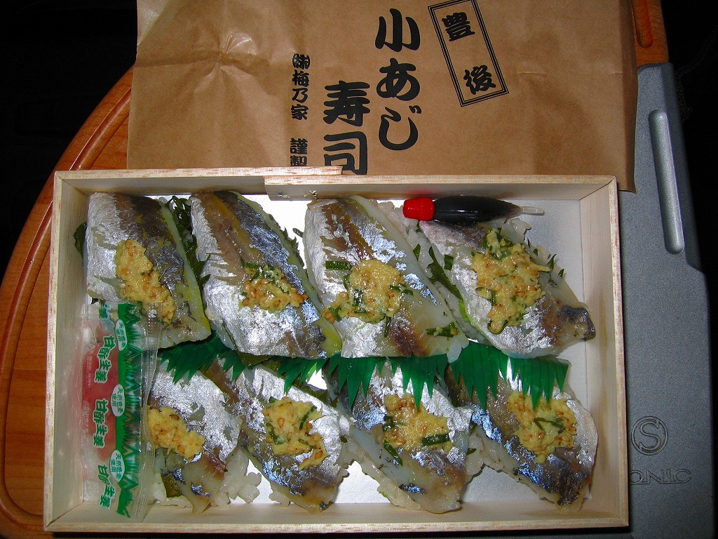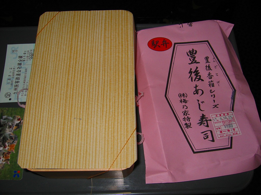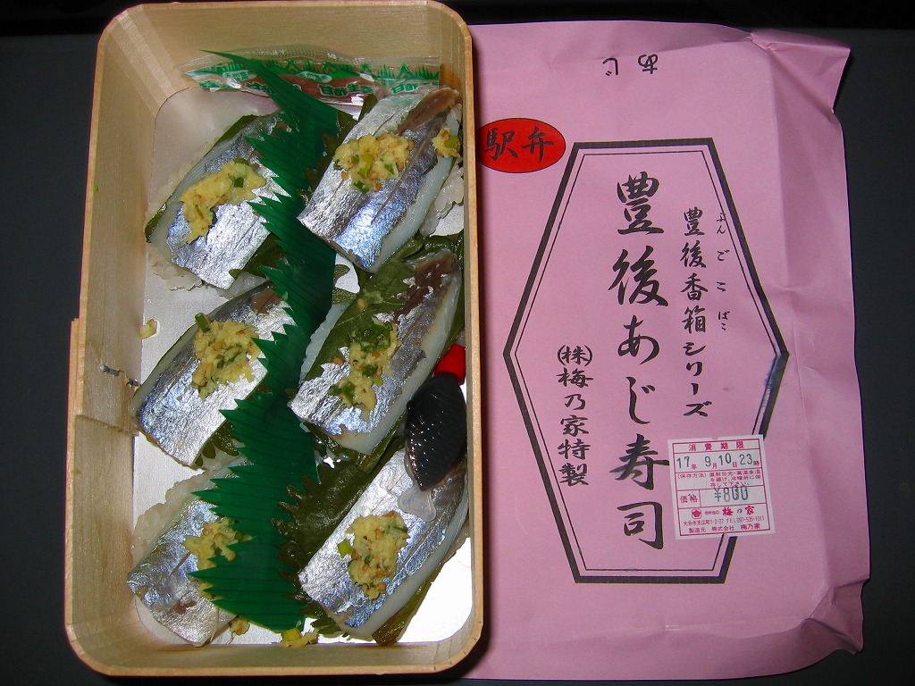 木枠の長方形の容器に木目調の紙ぶたをかけて輪ゴムで留め、さらに竹皮を巻いて商品名を書いた紙をかけて竹皮柄の針金でしばる。中身は大分米ひのひかりの酢飯に大葉を挟んで酢締めの小鯵を載せ、おろし生姜と刻みネギを添える、つまり小鯵寿司。列車内でこういう内容の商品をつまむシチュエーションを想像しにくいのだが、こういう内容で駅弁にしているのは驚いてよいと思うし、味もよいと思う。