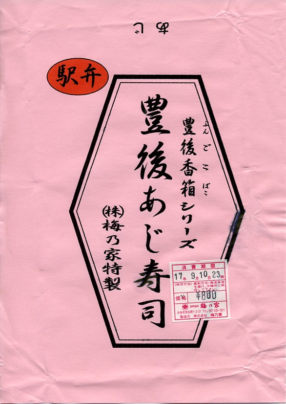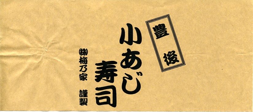 2004(平成16)年に6種類が誕生した小柄安価駅弁「豊後香箱シリーズ」のひとつ。というより従来の「あじずし」(525円)のリニューアルか。経木枠長方形の容器に木目柄ボール紙のフタをかけて輪ゴムでしばり、ピンク紙にインクジェットプリンタで文字を印刷した掛紙をかけてゴムでしばる。中身は生姜を盛りシソの葉を挟んだ酢締め鯵の握り寿司が6カン。
