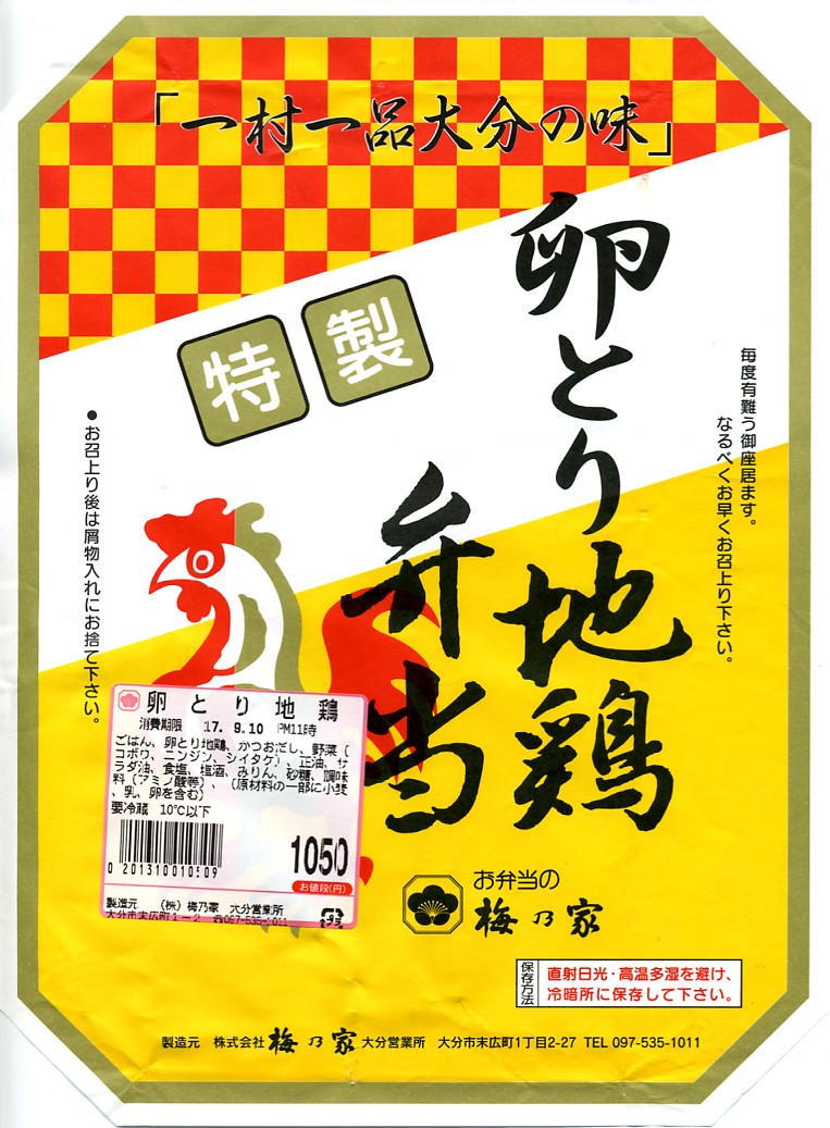 2002(平成14)年5月に発売。従前の駅弁「地鶏弁当」のリニューアルか。大分駅弁らしい大きめ長めな長方形経木枠の容器に木目調ボール紙のフタをして、地鶏弁当の文字だけ変えた昭和レトロな絵柄の掛紙で包み、2本のゴムで十字にしばる。