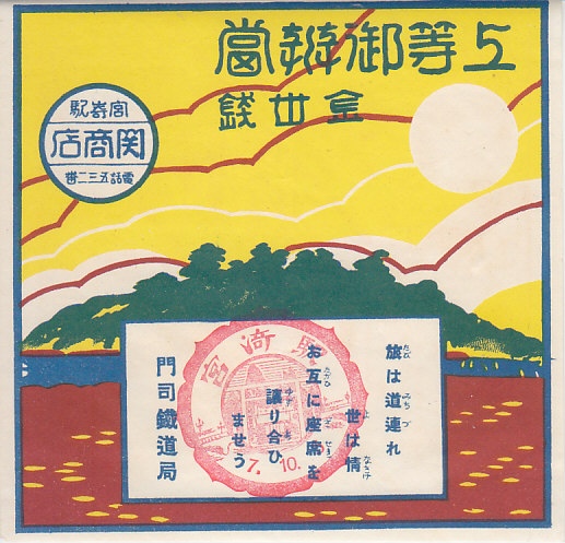 1932(昭和7)年10月5日のものと思われる、昔の宮崎駅弁の掛紙。調製印でなく、その日付の駅スタンプが押されたようにみえる。これはどの山か島を描いたのだろうか。調製元の関商店は、1920年代までには駅弁を売り始めた宮崎駅の構内営業者で、第二次大戦後までに廃業したという。