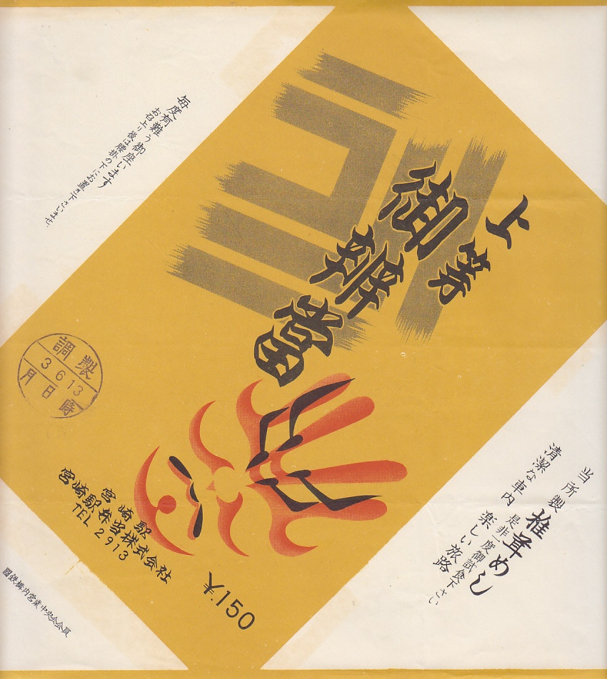 1970年代のものと思われる、昔の宮崎駅弁の掛紙。その絵柄は、上記の21世紀のものと変わらない。注意書きにより自動結束機というものがすでに導入されていたことがわかる。