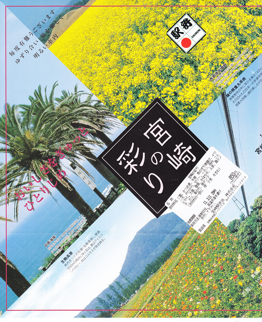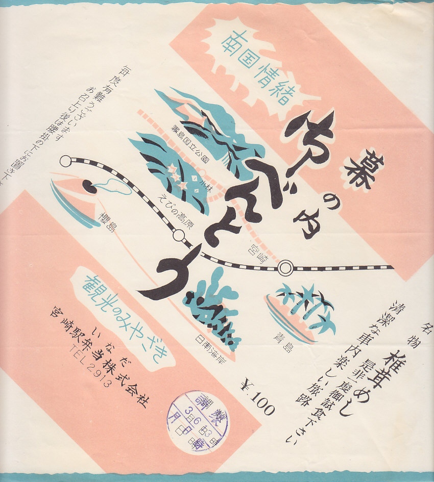 1960年代の、3月6日13時の調製と思われる、昔の宮崎駅弁の掛紙。路線図になっていない国有鉄道の地図記号に沿って、青島、日南海岸、えびの高原、霧島国立公園、櫻島の文字と絵柄を置いた。