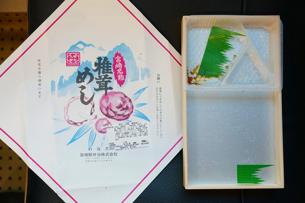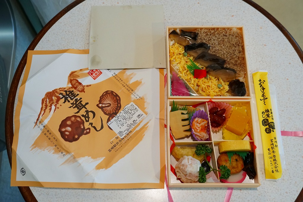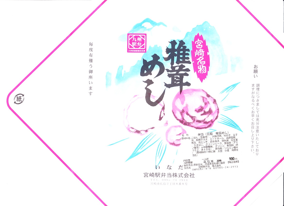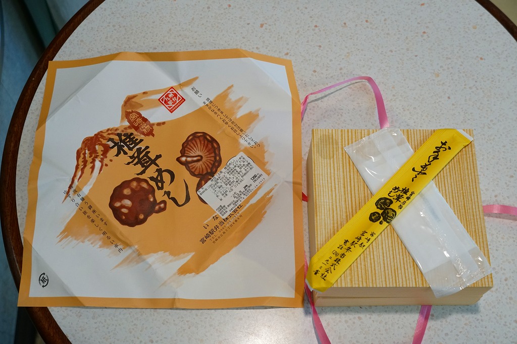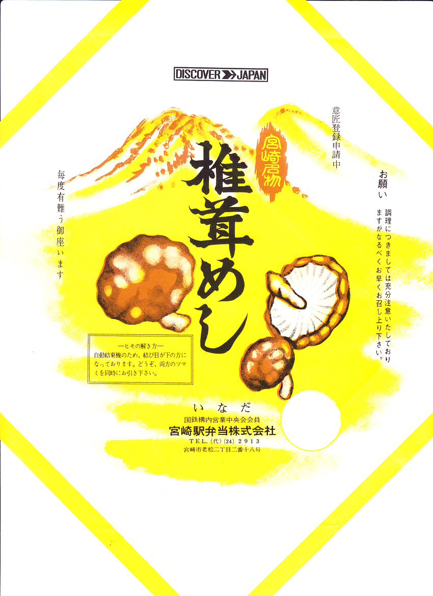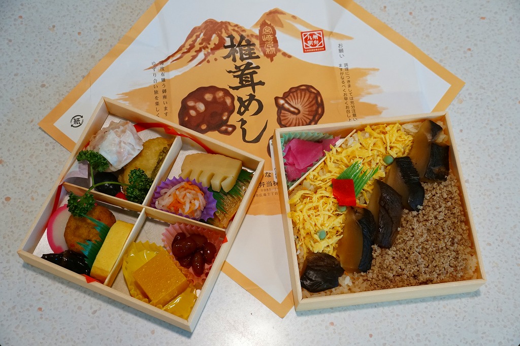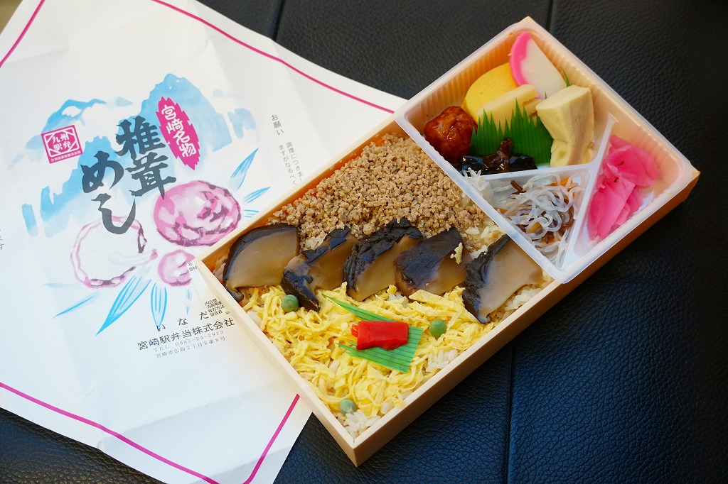 1953(昭和28)年の発売。宮崎駅を代表する駅弁。駅弁の名前は「元祖椎茸めし」と紹介されることがある。山岳と椎茸を描く掛紙の絵柄は、昭和時代から変わらない。長方形の容器に炊込飯を詰め、とりそぼろ、椎茸煮の肉厚なスライス、錦糸卵で覆い、紅生姜とグリーンピースで彩り、おかずのトレーに高野豆腐、タケノコ、かまぼこ、玉子焼、昆布巻、肉団子、春雨サラダ、大根桜漬を詰める。椎茸を名乗る駅弁が現存するのは珍しく、他には鳥取駅と静岡県の修善寺駅にあるくらい。メインの椎茸は、風味を出すために干し椎茸を水で戻して煮汁で煮たといい、量もうまみも豊かな味わい。価格は2003年時点で720円、2014年時点で760円、2020年時点で800円。、2023年時点で900円、2025年11月から1,000円。